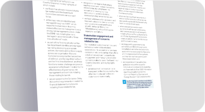 Strategic Shareholder Climate and Risk Financial Financial Barclays PLC 259 report information sustainability report Governance review review statements Annual Report 2022 ESG: Governance (continued) • our tax department comprises • our dealings with tax authorities are Tax governance, control and appropriately qualified in-house handled proactively, constructively and risk management transparently, in real-time where professionals who are subject to clear As a Globally Systemically Important Bank, standards including that they uphold our possible, our Group-wide risk and governance Tax Principles and follow our tax code of • we recognise that early resolution of our procedures are subject to continuous conduct, which is an integral part of how tax affairs is in everyone’s interest. We review and scrutiny. More details on our we operate, have ongoing engagement with tax approach to tax governance, control and authorities to discuss their inquiries and • our governance requires that suitably risk management can be found in our qualified people are involved in decisions material issues in relation to our tax Country Snapshot, the key highlights of related to tax, tax is fully taken into affairs, and we respond to feedback which include: account when making business from tax authorities, • our Board has ultimate responsibility for decisions and tax risk is identified, • where we face significant uncertainty in tax matters and the Board Audit assessed and kept under review, and relation to the application of tax law, we Committee oversees our approach • we have no tolerance for tax evasion and may seek to agree with the tax authority to tax, have well-established mechanisms for how the tax law should apply, • at Barclays, risks are identified and raising concerns about unethical or • where relevant we seek to reach managed through our ERMF, which unlawful behaviour through our agreement with tax authorities using supports the business in its aim to ‘Whistleblowing’ policy, which applies mechanisms available to all taxpayers embed effective risk management and a equally to tax matters. including Advance Pricing Agreements strong risk management culture. Under and Mutual Agreement Procedures to the ERMF risk, including tax risk is Stakeholder engagement and clearly establish in which territories our managed in accordance with a ‘three management of concerns profits should be taxed, lines of defence’ model, related to tax: • we engage with governments, tax • as part of the ‘first line of defence’ the Our reputation is very important to us and authorities and NGOs through public tax department identifies and manages we take our external stakeholders’ consultations and other discussions to tax risk by developing appropriate expectations into account when we make assist with the development of tax policy policies, standards and controls to apply decisions in relation to our tax affairs. More and the improvement of tax systems, across our organisation. Risk and details on our approach to stakeholder and maintain our transparency with Compliance comprise the ‘second line engagement and managing stakeholder these stakeholders; and of defence’, and Barclays Internal Audit concerns related to tax can be found in our are the ‘third line of defence’, and these • we cooperate with tax authorities Country Snapshot, and key highlights functions review, challenge and provide globally to reduce the scope for include: assurance to the Board in relation to the individuals and companies to evade tax, • we believe that it is important to be effectiveness of governance, risk and have met all of our 2022 information transparent in the disclosure of our tax management and controls including reporting obligations under the affairs both to tax authorities and those relating to tax risk, Common Reporting Standard and stakeholders more broadly, Foreign Account Tax Compliance Act. • we are subject to the Sarbanes-Oxley Act control requirements in relation to The BPLC Board Audit Committee is responsible for + financial statements disclosures considering the Group's tax strategy and overseeing compliance with the Group's Tax Principles. Please including those related to tax, refer to page 174 for details of BPLC Board Audit Committee oversight of tax related matters