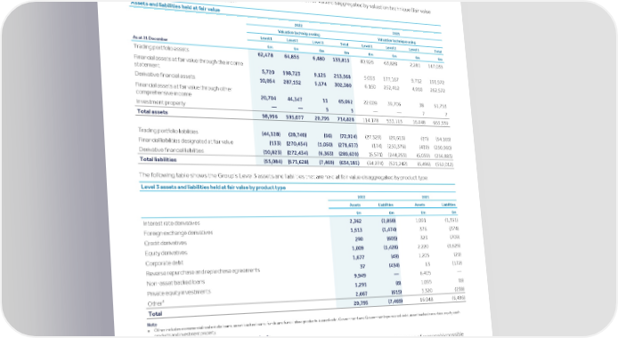 Strategic Shareholder Climate and Risk Financial Financial Barclays PLC 457 report information sustainability report Governance review review statements Annual Report 2022 Notes to the financial statements (continued) Assets and liabilities held at fair value Valuation technique using significant unobservable inputs – Level 3 Assets and liabilities are classified as Level 3 if their valuation incorporates significant inputs that are not based on observable market data (unobservable inputs). A valuation input is considered observable if it can be directly observed from transactions in an active market, or if there is compelling external evidence demonstrating an executable exit price. Unobservable input levels are generally determined via reference to observable inputs, historical observations or using other analytical techniques. The following table shows the Group’s assets and liabilities that are held at fair value disaggregated by valuation technique (fair value hierarchy) and balance sheet classification: Assets and liabilities held at fair value 2022 2021 Valuation technique using Valuation technique using Level 1 Level 2 Level 3 Total Level 1 Level 2 Level 3 Total As at 31 December £m £m £m £m £m £m £m £m Trading portfolio assets 62,478 64,855 6,480 133,813 80,926 63,828 2,281 147,035 Financial assets at fair value through the income statement 5,720 198,723 9,125 213,568 5,093 177,167 9,712 191,972 Derivative financial assets 10,054 287,152 5,174 302,380 6,150 252,412 4,010 262,572 Financial assets at fair value through other comprehensive income 20,704 44,347 11 65,062 22,009 39,706 38 61,753 Investment property — — 5 5 — — 7 7 Total assets 98,956 595,077 20,795 714,828 114,178 533,113 16,048 663,339 Trading portfolio liabilities (44,128) (28,740) (56) (72,924) (27,529) (26,613) (27) (54,169) Financial liabilities designated at fair value (133) (270,454) (1,050) (271,637) (174) (250,376) (410) (250,960) Derivative financial liabilities (10,823) (272,434) (6,363) (289,620) (6,571) (244,253) (6,059) (256,883) Total liabilities (55,084) (571,628) (7,469) (634,181) (34,274) (521,242) (6,496) (562,012) The following table shows the Group’s Level 3 assets and liabilities that are held at fair value disaggregated by product type: Level 3 assets and liabilities held at fair value by product type 2022 2021 Assets Liabilities Assets Liabilities £m £m £m £m Interest rate derivatives 2,362 (2,858) 1,091 (1,351) Foreign exchange derivatives 1,513 (1,474) 376 (374) Credit derivatives 290 (603) 323 (709) Equity derivatives 1,009 (1,428) 2,220 (3,625) Corporate debt 1,677 (49) 1,205 (21) Reverse repurchase and repurchase agreements 37 (434) 13 (172) Non-asset backed loans 9,949 — 6,405 — Private equity investments 1,291 (8) 1,095 (6) a Other 2,667 (615) 3,320 (238) Total 20,795 (7,469) 16,048 (6,496) Note a Other includes commercial real estate loans, asset backed loans, funds and fund-linked products, issued debt, Government and Government sponsored debt, asset backed securities, equity cash products and investment property. Valuation techniques and sensitivity analysis Sensitivity analysis is performed on products with significant unobservable inputs (Level 3) to generate a range of reasonably possible alternative valuations. The sensitivity methodologies applied take account of the nature of the valuation techniques used, as well as the availability and reliability of observable proxy and historical data and the impact of using alternative models. Sensitivities are dynamically calculated on a monthly basis. The calculation is based on range or spread data of a reliable reference source or a scenario based on relevant market analysis alongside the impact of using alternative models. Sensitivities are calculated without reflecting the impact of any diversification in the portfolio. The valuation techniques used, observability and sensitivity analysis for material products within Level 3, are described below. Interest rate derivatives Description: Derivatives linked to interest rates or inflation indices. The category includes futures, interest rate and inflation swaps, swaptions, caps, floors, inflation options, balance guaranteed swaps and other exotic interest rate derivatives. Valuation: Interest rate and inflation derivatives are generally valued using curves of forward rates constructed from market data to project and discount the expected future cash flows of trades. Instruments with optionality are valued using volatilities implied from market inputs, and use industry standard or bespoke models depending on the product type.