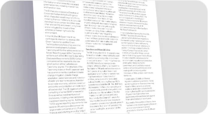 Strategic Shareholder Climate and Risk Financial Financial Barclays PLC 377 report information sustainability report Governance review review statements Annual Report 2022 Supervision and regulation (continued) commence on a phased basis from the In March 2022, the SEC proposed climate The Sanctions and Anti-Money Laundering financial year 2024. Draft sustainability related-disclosure requirements for US- Act (the Sanctions Act) became law in the UK in 2018. The Sanctions Act allows for reporting standards are being developed listed companies (which would include by the European Financial Reporting Barclays PLC and Barclays Bank PLC) that the adoption of an autonomous UK Advisory Group. would, among other things, require sanctions regime, as well as a more flexible disclosure of direct and indirect licensing regime post-Brexit. On 6 July From June 2022, the EU’s Capital greenhouse gas emissions, with certain 2020, the UK Government announced the Requirements Regulation requires certain first sanctions that have been emissions disclosures subject to third- large financial institutions to disclose party attestation requirements; climate- implemented independently by the UK information on environmental, social and related scenario analysis (if the issuer outside the auspices of the UN and EU. governance risks, including physical risks conducts scenario analysis), together with The autonomous UK sanctions regime and transition risks. qualitative and quantitative information came into force on 1 January 2021. The The EU has also proposed a Directive on sanctions apply within the UK and in about the hypothetical future climate Corporate Sustainability Due Diligence scenarios used in its analysis; climate relation to the conduct of all UK persons which, if adopted, would require EU firms, transition plans or climate-related targets wherever they are in the world; they also including financial institutions, to carry out or goals, along with disclosure of progress apply to overseas branches of UK due diligence on companies in their value against any such plans, targets or goals; companies (including the Barclays Bank chain and identify and prevent, bring to an PLC New York branch). climate-related risks over the short-, end or mitigate the impact of their medium- and long-term; qualitative and In the US, the Bank Secrecy Act, the USA activities on human rights and the quantitative information regarding PATRIOT Act 2001, the Anti-Money environment. climate-related risks and historical impacts Laundering Act of 2020 and regulations In the UK, the UK Government has in audited financial statements; corporate thereunder contain numerous anti-money confirmed its intention to develop a UK governance of climate-related risks; and laundering and anti-terrorist financing Green Taxonomy, and the Green climate-related risk-management requirements for financial institutions. In Technical Advisory Group has published processes. addition, the Group is subject to the US advice on development of a Green Sanctions and financial crime Foreign Corrupt Practices Act, which Taxonomy with further advice expected to prohibits, among other things, corrupt The UK Bribery Act 2010 introduced a new follow. Reporting against the Taxonomy payments to foreign government officials. form of corporate criminal liability focused will form part of the UK’s new Sustainability It is also subject to various economic broadly on a company’s failure to prevent Disclosure Requirements (SDR). Certain sanctions laws, regulations and executive bribery on its behalf. The Criminal Finances companies will be required to disclose orders administered by the US Act 2017 introduced new corporate which portion of their activities are government, which prohibit or restrict criminal offences of failing to prevent the Taxonomy-aligned. The structure of the some or all business activities and other facilitation of UK and overseas tax evasion. Taxonomy draws on the EU approach and dealings with or involving certain Both pieces of legislation have broad has six environmental objectives (climate individuals, entities, groups, countries and application and in certain circumstances change mitigation, climate change territories. may have extraterritorial impact on adaptation, sustainable use and protection entities, persons or activities located In some cases, US state and federal of water and marine resources, transition outside the UK, including Barclays PLC’s regulations addressing sanctions, money to a circular economy, pollution prevention subsidiaries outside the UK. The UK Bribery laundering and other financial crimes may and control and protection and restoration Act requires the Group to have adequate impact entities, persons or activities of biodiversity). The UK regulators are also procedures to prevent bribery which, due located or undertaken outside the US, consulting on a new SDR Framework for to the extraterritorial nature of the Act, including Barclays PLC and its subsidiaries. firms as well as investment product makes this both complex and costly. US government authorities have disclosures, including a new sustainable Additionally, the Criminal Finances Act aggressively enforced these laws against investment labelling regime. Additionally, requires the Group to have reasonable financial institutions in recent years. TCFD-aligned reporting requirements now prevention procedures in place to prevent apply to UK publicly quoted companies, As a result of the conflict in Ukraine, there the criminal facilitation of tax evasion by large private companies and LLPs with has been an increased regulatory focus on persons acting for, or on behalf of, the sanctions compliance in various financial years starting on or after 6 April Group. 2022 (in addition to existing TCFD-related jurisdictions, including in the US, UK and reporting requirements under the Listing EU. Rules). Failure of a financial institution to ensure compliance with such laws coul