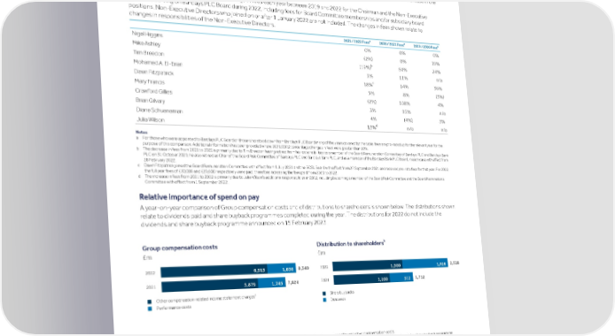 Strategic Shareholder Climate and Risk Financial Financial Barclays PLC 239 report information sustainability report Governance review review statements Annual Report 2022 Remuneration report (continued) BPLC only employs a very small number of Head Office employees (51 for 2022) and there is frequent movement of employees between BPLC and other entities within the Barclays Group. To make a meaningful year-on-year comparison, the figures are therefore based on those individuals who were employed by BPLC in both years (34 individuals). The fixed pay increase for this population of 10% is due to a few fixed pay increases following material changes in role in this very small population. The average bonus decrease of 2% is principally a consequence of the decrease in Group-wide incentive pool in 2022. The benefits value has increased due an increase in the cost of income protection and private medical insurance. The table below shows the percentage change in fees each year between 2019 and 2022 for the Chairman and the Non-Executive Directors serving on Barclays PLC Board during 2022, including fees for Board Committee memberships and/or subsidiary board positions. Non-Executive Directors who joined on or after 1 January 2022 are not included. The changes in fees shown relate to changes in responsibilities of the Non-Executive Directors. a a a 2021 / 2022 Fees 2020 / 2021 Fees 2019 / 2020 Fees Nigel Higgins 0% 0% 0% Mike Ashley (2%) 0% 19% b Tim Breedon (19%) 64% 24% Mohamed A. El-Erian 3% 11% n/a c Dawn Fitzpatrick 18% 14% 36% Mary Francis 5% 8% (3%) Crawford Gillies (2%) 108% 4% Brian Gilvary 3% 95% n/a Diane Schueneman 4% (4%) 3% d Julia Wilson 13% n/a n/a Notes a For those who were appointed to Barclays PLC Board or those who stood down from Barclays PLC Board in any of the years covered by the table, fees are pro-rated up for the relevant year for the purpose of this comparison. Additional information has been provided where 2021/2022 percentage changes in fees were greater than 10%. b The decrease in fees from 2021 to 2022 is primarily due to Tim Breedon having retired from his responsibilities as a member of the Board Remuneration Committee of Barclays PLC and Barclays Bank PLC on 31 October 2021; he also retired as Chair of the Board Risk Committee of Barclays PLC and Barclays Bank PLC, and as a member of the Barclays Bank PLC Board, in each case with effect from 28 February 2022. c Dawn Fitzpatrick joined the Board Remuneration Committee with effect from 1 July 2021 and the BCSL Board with effect from 27 September 2021 and received pro-rata fees for that year. For 2022, the full year fees of £30,000 and £20,000 respectively were paid, therefore increasing the fees paid from 2021 to 2022. d The increase in fees from 2021 to 2022 is primarily due to Julia Wilson's additional responsibilities in 2022, including becoming a member of the Board Risk Committee and the Board Nominations Committee with effect from 1 September 2022. Relative importance of spend on pay A year-on-year comparison of Group compensation costs and of distributions to shareholders is shown below. The distributions shown relate to dividends paid and share buyback programmes completed during the year. The distributions for 2022 do not include the dividends and share buyback programme announced on 15 February 2023. b Group compensation costs Distribution to shareholders £m £m 2022 2022 8,349 2,528 6,513 1,836 1,500 1,028 2021 2021 7,624 1,712 5,879 1,745 1,200 512 a Other compensation-related income statement charges Share buybacks n n Performance costs Dividends n n Notes a Relates to costs arising from salaries and other elements of fixed pay, social security costs, post-retirement benefits and other compensation costs. b The chart shows dividends paid and share buyback programmes completed during the year, i.e. for 2022, the figure represents the 2021 full year dividend paid, the share buyback programme announced with the 2021 results, the 2022 half year dividend, and the share buyback programme announced with the half year results. The shareholder distributions announced on 15 February 2023 are not reflected in this chart.