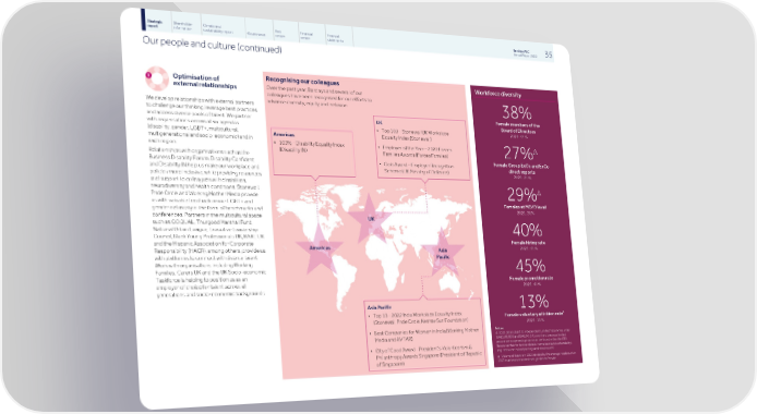 Strategic Shareholder Climate and Risk Financial Financial Barclays PLC 35 report information sustainability report Governance review review statements Annual Report 2022 Our people and culture (continued) Recognising our colleagues Workforce diversity Optimisation of Over the past year, Barclays and several of our external relationships colleagues have been recognised for our efforts to advance diversity, equity and inclusion. 38% We develop relationships with external partners to challenge our thinking, leverage best practices Female members of the and access diverse pools of talent. We partner UK Board of Directors with organisations across all six agendas 2021: 33% • Top 100 - Stonewall UK Workplace (disability, gender, LGBT+, multicultural, Equality Index (Stonewall) Americas multigenerational and socio-economic) and in • 100% - Disability Equality Index ∆ • Employer of the Year – 2022 Forces each region. 27% (Disability:IN) Families Awards (Forces Families) Relationships with organisations such as the Female Group ExCo and ExCo Business Disability Forum, Disability Confident • Gold Award – Employer Recognition direct reports and Disability:IN help us make our workplace and Scheme (UK Ministry of Defence) 2021: 25% policies more inclusive, while providing resources and support to colleagues with disabilities, neurodiversity and health conditions. Stonewall, ∆ 29% Pride Circle and Working Mother Media provide us with valuable feedback on our LGBT+ and Females at MD/D level gender inclusivity in the form of benchmarks and 2021: 28% conferences. Partners in the multicultural space such as COQUAL, Thurgood Marshall Fund, National Urban League, Executive Leadership 40% Council, Black Young Professionals UK, RARE UK Female hiring rate and the Hispanic Association for Corporate 2021: 39% Responsibility (HACR), among others, provide us with platforms to connect with diverse talent. Work with organisations including Working Families, Carers UK and the UK Socio-economic 45% Taskforce is helping to position us as an Female promotion rate employer of choice for talent across all 2021: 47% generations and socio-economic backgrounds. Asia Pacific 13% • Top 10 - 2022 India Workplace Equality Index a Female voluntary attrition rate (Stonewall, Pride Circle, Keshav Suri Foundation) 2021: 11% Notes: • Best Companies for Women in India (Working Mother Δ 2022 data subject to independent Limited Assurance under Media and AVTAR) ISAE(UK)3000 and ISAE3410. Current and previous limited assurance scope and opinions can be found within the ESG Resource Hub for further details: home.barclays/sustainability/ • City of Good Award - President’s Volunteerism & esg-resource-hub/reporting-and-disclosures/ Philanthropy Awards Singapore (President of Republic a Volume of leavers in 2022 divided by the average headcount in of Singapore) 2022 that have recorded their gender as female