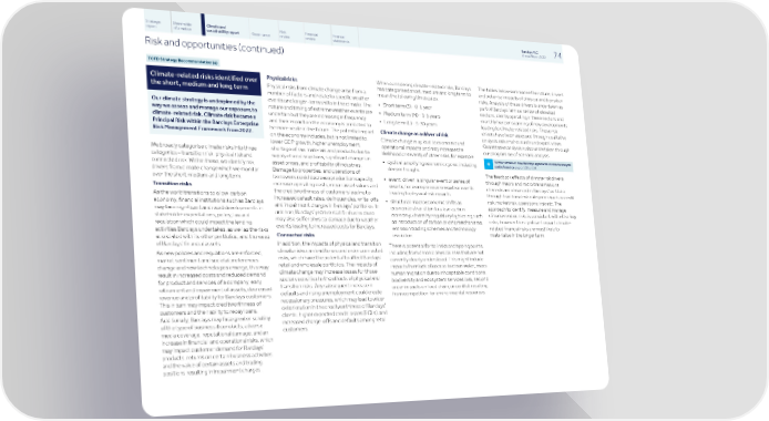 Strategic Shareholder Climate and Risk Financial Financial Barclays PLC 74 report information sustainability report Governance review review statements Annual Report 2022 Risk and opportunities (continued) TCFD Strategy Recommendation (a) When considering climate-related risks, Barclays The tables below summarise the nature, drivers Physical risks Climate-related risks identified over has categorised short, medium and long term to and potential impacts of physical and transition Physical risks from climate change arise from a mean the following timescales: the short, medium and long term risks. Analysis of these drivers is undertaken as number of factors and relate to specific weather part of Barclays' annual review of elevated • Short term (S) - 0-1 year events and longer-term shifts in the climate. The sectors, clients operating in these sectors and Our climate strategy is underpinned by the nature and timing of extreme weather events are • Medium term (M) - 1-5 years monthly horizon scanning of new developments way we assess and manage our exposure to uncertain but they are increasing in frequency • Long term (L) - 5-30 years leading to climate-related risks. These risk climate-related risk. Climate risk became a and their impact on the economy is predicted to drivers have been assessed through qualitative Principal Risk within the Barclays Enterprise Climate change as a driver of risk be more acute in the future. The potential impact analysis, external research and expert views. Risk Management Framework from 2022. on the economy includes, but is not limited to, Climate change may lead to economic and Quantitative analysis is also undertaken through lower GDP growth, higher unemployment, operational impacts and may increase the our programme of scenario analysis. shortage of raw materials and products due to We broadly categorise climate risks into three likelihood or severity of other risks, for example: Further details on how Barclays approaches scenario analysis supply chain disruptions, significant changes in categories – transition risk, physical risk and + • cyclical: amplifying economic cycles, including can be found on pages 128 to 134. asset prices, and profitability of industries. connected risk. Within these, we identify risk deeper troughs Damage to properties, and operations of drivers from climate change which we monitor The feedback effects of climate risk drivers • event-driven: a singular event or series of borrowers could decrease production capacity, over the short, medium and long term. through macro and micro transmissions events, for example severe weather events increase operating costs, impair asset values and channels are observed in Barclays' portfolio Transition risks leading to physical risk impacts the creditworthiness of customers leading to through traditional risk categories such as credit As the world transitions to a low-carbon increased default rates, delinquencies, write-offs risk, market risk, operational risk etc. The • structural: macroeconomic shifts as economy, financial institutions such as Barclays and impairment charges in Barclays’ portfolios. In approach to identify, measure and manage economies transition to a low-carbon may face significant and rapid developments in addition, Barclays’ premises and infrastructure climate-related risks is consistent with other key economy, driven by regulatory tightening such stakeholder expectations, policy, law and may also suffer physical damage due to weather risks, however the significant impact climate- as introduction of carbon pricing mechanisms, regulation which could impact the lending events leading to increased costs for Barclays. related financial risks are most likely to emission trading schemes and technology activities Barclays undertakes, as well as the risks materialise in the longer term. evolution. Connected risks associated with its other portfolios, and the value In addition, the impacts of physical and transition of Barclays’ financial assets. There is potential for tail risks and tipping points, climate risks can lead to second order connected including from chronic physical risks that are not As new policies and regulations are enforced, risks, which have the potential to affect Barclays’ currently clearly understood. This might include market sentiment and societal preferences retail and wholesale portfolios. The impacts of impacts from lack of access to clean water, mass change and new technologies emerge, this may climate change may increase losses for those human migration due to inhospitable conditions, result in increased costs and reduced demand sectors sensitive to the effects of physical and biodiversity and ecosystem services loss, second for product and services of a company, early transition risks. Any subsequent increase in order impacts on food chain, or conflict resulting retirement and impairment of assets, decreased defaults and rising unemployment could create from competition for environmental resources. revenue and profitability for Barclays customers. recessionary pressures, which may lead to wider This in turn may impact creditworthiness of deterioration in the creditworthiness of Barclays’ customers and their ability to repay loans. clients, higher expected credit losses (ECLs), and Additionally, Barclays may face greater scrutiny increased charge-offs and defaults among retail of the type of business it conducts, adverse customers. media coverage, reputational damage, and an increase in financial and operational risks, which may impact customer demand for Barclays’ products, returns on certain business activities and the value of certain assets and trading positions resulting in impairment charges.