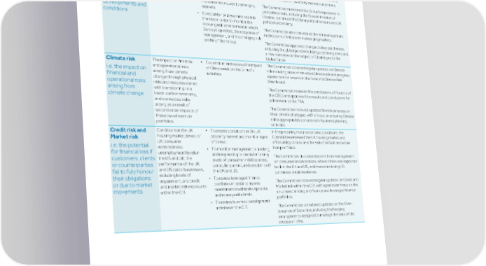 Strategic Shareholder Climate and Risk Financial Financial Barclays PLC 183 report information sustainability report Governance review review statements Annual Report 2022 Directors’ report: Board Risk Committee report (continued) Areas of focus Matters addressed Role of Committee Conclusion/action taken The Committee considered macroeconomic trends, The potential impact on ▪ To consider trends in the Risk profile the Group’s risk profile of economies of our key markets, in including economic slowdown in most major economies, i.e. the impact on geopolitical and particular the UK and US. inflationary pressures, energy market disruption, rising the Group’s risk macroeconomic interest rates, affordability pressures for consumers, • To assess the geopolitical tensions profile of developments. and increased risk of disorderly market corrections. across the globe. geopolitical and The Committee monitored the Group's exposures to • To review exposures to emerging macroeconomic markets. geopolitical risks, including the Russian invasion of developments and Ukraine, continued US/China political tensions and UK • To establish and examine key risk conditions political uncertainty. themes in order to monitor the evolving risk environment in which The Committee also considered the risk management Barclays operates, the response of implications of initiatives in emerging markets. management, and the changing risk The Committee approved changes to key risk themes, profile of the Group. including the global pandemic being a declining trend and a new overview on the subject of Challenges to the Global Order. The impact on financial ▪ To consider and assess the impact The Committee received regular updates on Climate Climate risk and operational risks of Climate risk on the Group’s risk including areas of elevated Climate risk and progress i.e. the impact on arising from climate activities. against sector targets in the form of a Climate Risk financial and change through physical Dashboard. operational risks risks and risks associated The Committee reviewed the conclusions of Round 2 of with transitioning to a arising from the CBES and approved the results and conclusions for lower-carbon economy, climate change submission to the PRA. and connected risks arising as a result of The Committee received updates from businesses on second order impacts of their climate strategies, with a focus on ensuring Climate these two drivers on risk is appropriately considered in business planning portfolios. activities. Conditions in the UK ▪ To assess conditions in the UK In the prevailing macroeconomic conditions, the Credit risk and housing market; levels of property market and monitor signs Committee reviewed the UK housing market and Market risk UK consumer of stress. affordability criteria and the risk of default on certain i.e. the potential indebtedness; loan portfolios. • To monitor management’s tracking for financial loss if unemployment levels in and responding to persistent rising The Committee discussed reports from management the US and UK; the customers, clients levels of consumer indebtedness, on consumer indebtedness, where stress was expected performance of the UK or counterparties particularly unsecured credit in both both in the UK and US, with trends including US and US cards businesses, the UK and US. fail to fully honour consumer credit weakness. including levels of their obligations; • To review leveraged finance impairment; and credit The Committee received regular updates on Credit and portfolios in order to assess or due to market and market risk exposures Market risk within the CIB, with a particular focus on the maintenance within risk appetite movements within the CIB. structured lending and finance and leveraged finance and manageable limits. portfolios. • To review business development The Committee considered updates on the Over- activities in the CIB. issuance of Securities, including the hedging arrangements designed to manage the risks of the rescission offer.
