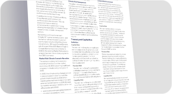 Strategic Shareholder Climate and Risk Financial Financial Barclays PLC 287 report information sustainability report Governance review review statements Annual Report 2022 Principal risk management (continued) Climate Risk Assessment • the scenario is meant to test the bank’s preparation. The climate related risks are ability to absorb a large shock by identified using severe yet plausible Market risk arising from climate change is climate related scenarios to provide combining Transition and Physical risks. measured by applying a range of stress qualitative and/or quantitative impacts on, scenarios, that stress the core risks Stress losses arising from this scenario or in addition to financial risk drivers. susceptible to climate change over long measure and aggregate climate-related and short-term horizons to individual risk Climate Risk Assessment risks, and are calculated quarterly. factors. Treasury & Capital Risk have focused on Climate Risk Management Initially a Climate Internal Stress Test building awareness of how the areas within The pattern of stress losses arising from (Climate-IST) was run in 2020 to further our risk oversight may be impacted by the stress scenario is used to estimate and inform understanding of climate risks. physical, transition and connected risks, set ongoing limits, consistent with the and calibration of key indicators for regular Market Risk performed an assessment of Board-approved maximum stress loss the impact of a disorderly transition to a reporting and monitoring. The function has capacity for Market risk, under which low-carbon economy on the market risk continued to build upon our understanding Barclays monitors and controls Market risk portfolios across Barclays Group. of climate risks, including through Barclays’ arising from climate change. These limits participation in CBES and the addition of In addition to the main Markets portfolios, are reviewed on an annual basis and must climate risk elements to internal stress Cross Markets and Commodities include consideration of potential portfolio tests. portfolios were also included. This risk impacts arising from climate-related risks. assessment was enabled by Capital Risk Furthermore, climate-related Market risk is enhancements in system technology Barclays’ capital position is indirectly managed through ongoing monitoring that allowing the exploration of climate change subject to climate risk through Group-wide is reported through the existing risk impact on less-climate risk exposed exposures across all risk types. Treasury & committee structures so that key risk sectors. Capital Risk oversees the bank’s capital indicators are monitored and escalated as management and planning activities and Market Risk continues to run such required. use the output of Group-wide climate Climate-IST scenarios every quarter, and Treasury and Capital Risk stress tests to inform our understanding has further refined the existing sector/ of how capital management may be Definition country taxonomy to reflect the climate impacted. Further consideration to climate risk sensitivity. Although Market Risk was Capital Risk risk has also been incorporated into the out of scope of the 2021 Bank of England The risk that the Group has an insufficient Group’s ICAAP narrative. Climate Biennial Exploratory Scenario level or composition of capital to support (CBES), the existing Market Risk scenario Pension Risk its normal business activities and to meet analysis has been more closely aligned to its regulatory capital requirements under Pension exposures are subject to climate the CBES scenarios. normal operating environments or stresses impacting market conditions. Market Risk Climate Scenario Narrative stressed conditions (both actual and as Pension holdings are primarily affected by defined for internal planning or regulatory interest rates, inflation and credit spreads The scenario is designed to explore a testing purposes). which may be impacted by longer term disorderly transition to a low-carbon climate change effects. To identify key economy until 2050, assuming insufficient Pension Risk areas of focus pension scheme assets progress in climate policy changes until The risk that the Group's capital and/or have been categorised based on their 2030. distributable earnings are reduced due to country and industry risk through the lens In 2030, the climate policy changes are put changes in the value of the Group's of climate change. in place at speed in order to meet the defined benefit obligations or the assets Liquidity Risk global climate targets by 2050 which funding these defined benefit obligations. causes global macroeconomic shock and Barclays proactively reviews its approach Liquidity Risk adverse market reaction in 2030, followed to managing funding and liquidity risks that The risk that the Group is unable to meet by markets recovery in 2031 (no other risk- may arise from certain physical risks such its contractual or contingent obligations or off episodes until 2050): as extreme weather events, or transition that it does not have the appropriate risks such as a move to a low-carbon • severe and prolonged global recession, amount, tenor and composition of funding economy. An enhanced risk assessment elevated risk premium, rise in and liquidity to support its assets. has been performed during 2022 to unemployment and borrowing cost, Interest Rate Risk in the Banking Book explore the potential vulnerabilities to sharp drop in global demand and in (IRRBB) certain industries and asset classes that economic activity, housing market The risk that the Group is exposed to may be subject to a lack of available slump capital or income volatility because of a liquidity under a climate stress scenario. • supply disruptions alongside currency mismatch between the interest rate Additional scenario analysis has been weakness and trade war causes sharp exposures of its (non-traded) assets and carried out during 