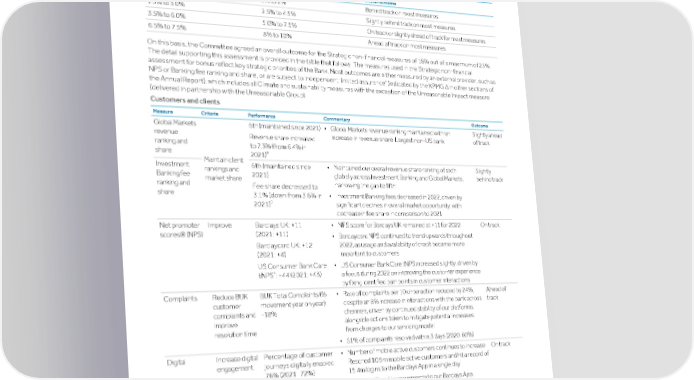 Strategic Shareholder Climate and Risk Financial Financial Barclays PLC 220 report information sustainability report Governance review review statements Annual Report 2022 Remuneration report (continued) Assessment of the Strategic non-financial measures for the 2022 annual bonus For 2022, the weighting of the Strategic non-financial element was 25%, within which the Customers and clients and Colleagues sections are each weighted at 7.5% and the Climate and sustainability section is weighted at 10%. Progress in relation to each of the Strategic non-financial measures was assessed by the Committee. The overall assessment was based on the following scale: For Customer and Clients and For Climate and sustainability Colleagues (max weighting 7.5%) (max weighting 10%) Overall outcome 0% to 1% 0% to 2% Behind track on most measures 1.5% to 3.0% 2.5% to 4.5% Slightly behind track on most measures 3.5% to 6.0% 5.0% to 7.5% On track or slightly ahead of track for most measures 6.5% to 7.5% 8% to 10% Ahead of track on most measures On this basis, the Committee agreed an overall outcome for the Strategic non-financial measures of 18% out of a maximum of 25%. The detail supporting this assessment is provided in the table that follows. The measures used in the Strategic non-financial assessment for bonus reflect key strategic priorities of the Bank. Most outcomes are either measured by an external provider, such as NPS or Banking fee ranking and share, or are subject to independent ‘limited assurance’ (indicated by the KPMG Δ in other sections of the Annual Report), which includes all Climate and sustainability measures with the exception of the Unreasonable Impact measure (delivered in partnership with the Unreasonable Group). Customers and clients Measure Criteria Performance Commentary Outcome Global Markets 6th (maintained since 2021) • Global Markets revenue ranking maintained with an Slightly ahead revenue increase in revenue share. Largest non-US bank of track Revenue share increased ranking and to 7.3% (from 6.4% in a share 2021) Maintain client Investment 6th (maintained since • Maintained our overall revenue share ranking of sixth Slightly rankings and Banking fee 2021) globally across Investment Banking and Global Markets, behind track market share ranking and narrowing the gap to fifth Fee share decreased to share 3.1% (down from 3.6% in • Investment Banking fees decreased in 2022, driven by b 2021) significant declines in overall market opportunity, with decrease in fee share in comparison to 2021 Net promoter Improve Barclays UK: +11 • NPS score for Barclays UK remained at +11 for 2022 On track scores® (NPS) (2021: +11) • Barclaycard NPS continued to trend upwards throughout Barclaycard UK: +12 2022, as usage and availability of credit became more (2021: +4) important to customers US Consumer Bank Care • US Consumer Bank Care tNPS increased slightly, driven by c tNPS : +44 (2021: +43) a focus during 2022 on improving the customer experience by fixing identified pain points in customer interactions • Rate of complaints per 10k interaction reduced by 24%, Ahead of Complaints Reduce BUK BUK Total Complaints (% customer movement year on year): despite an 8% increase in interactions with the bank across track complaints and -18% channels, driven by continued stability of our platforms, improve alongside actions taken to mitigate potential increases resolution time from changes to our servicing model • 61% of complaints resolved within 3 days (2020: 60%) Digital Increase digital Percentage of customer • Number of mobile active customers continues to increase. On track engagement journeys digitally enabled: Reached 10.5m mobile active customers and hit a record of 76% (2021: 72%) 15.4m logins to the Barclays App in a single day Mobile active customers: • Made significant improvements to our Barclays App, 10.5m (2021: 9.7m) including enabling mortgage customers to switch onto a new rate up to 180 days before their current rate expires CCP US customer digital d without the need to book an appointment when advice is engagement: 74.1% not required (2021: 71.8%) • The US Consumer business continued to invest in the digital servicing model, partner app functionalities and expanding the product range. Digital active user rate increased from 2021 Total Customers and clients: 5.0% a Global Markets share and rank for Barclays is based on our share of Top 10 banks reported revenues. Peer banks include Bank of America, BNP Paribas, Citigroup, Credit Suisse, Deutsche Bank, Goldman Sachs, JP Morgan Chase & Co, Morgan Stanley and UBS. b Dealogic for the period covering 1 January 2021 to 31 December 2022. FY21 market share has been restated from last year’s published value based on latest analysis. c Care tNPS provides an accurate measure of customer sentiment across our Fraud, Dispute, Credit and Care channels and replaces the relationship NPS reported in 2021 Annual Report. d Excludes new Gap customers.