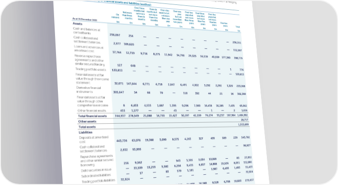 Strategic Shareholder Climate and Risk Financial Financial Barclays PLC 351 report information sustainability report Governance review review statements Annual Report 2022 Risk performance - Treasury and Capital risk (continued) Contractual maturity of financial assets and liabilities The table below provides detail on the contractual maturity of all financial instruments and other assets and liabilities. Derivatives (other than those designated in a hedging relationship) and trading portfolio assets and liabilities are included in the ‘on demand’ column at their fair value. Liquidity risk on these items is not managed on the basis of contractual maturity since they are not held for settlement according to such maturity and will frequently be settled before contractual maturity at fair value. Derivatives designated in a hedging relationship are included according to their contractual maturity. Contractual maturity of financial assets and liabilities (audited) Over three Over six Over nine Over one Over two Over three Over five months but months but months but year years but years but years but Not more not more not more not more but not not more not more not more On than three than six than nine than one more than than three than five than ten Over ten demand months months months year two years years years years years Total As at 31 December 2022 £m £m £m £m £m £m £m £m £m £m £m Assets Cash and balances at central banks 256,097 254 — — — — — — — — 256,351 Cash collateral and settlement balances 2,977 109,620 — — — — — — — — 112,597 Loans and advances at amortised cost 17,764 12,719 9,716 8,275 11,942 34,790 29,325 56,519 40,539 177,190 398,779 Reverse repurchase agreements and other similar secured lending 127 648 — — — — — — — 1 776 Trading portfolio assets 133,813 — — — — — — — — — 133,813 Financial assets at fair value through the income statement 32,071 147,644 6,771 4,718 2,047 6,491 4,922 3,292 2,292 3,320 213,568 Derivative financial instruments 301,647 54 66 70 — 110 352 44 21 16 302,380 Financial assets at fair value through other comprehensive income 8 6,433 4,535 1,687 1,395 9,206 7,560 16,418 10,385 7,435 65,062 Other financial assets 433 1,177 — — 43 — — 1 — 2 1,656 Total financial assets 744,937 278,549 21,088 14,750 15,427 50,597 42,159 76,274 53,237 187,964 1,484,982 Other assets 28,717 Total assets 1,513,699 Liabilities Deposits at amortised cost 443,736 63,076 19,388 5,090 8,575 4,263 327 499 589 239 545,782 Cash collateral and settlement balances 2,932 93,995 — — — — — — — — 96,927 Repurchase agreements and other similar secured borrowing 256 9,562 — — 943 1,105 5,034 10,069 — 83 27,052 Debt securities in issue — 33,109 13,259 5,582 6,294 9,435 6,817 14,808 15,526 8,051 112,881 Subordinated liabilities — 17 — 83 179 1,181 — 1,987 6,493 1,483 11,423 Trading portfolio liabilities 72,924 — — — — — — — — — 72,924 Financial liabilities designated at fair value 10,844 186,733 14,352 5,292 3,812 14,000 10,548 8,528 6,708 10,820 271,637 Derivative financial instruments 288,573 45 63 5 2 157 105 273 56 341 289,620 Other financial liabilities 86 7,803 43 43 41 261 148 247 391 93 9,156 Total financial liabilities 819,351 394,340 47,105 16,095 19,846 30,402 22,979 36,411 29,763 21,110 1,437,402 Other liabilities 7,037 Total liabilities 1,444,439 Cumulative liquidity gap (74,414) (190,205) (216,222) (217,567) (221,986) (201,791) (182,611) (142,748) (119,274) 47,580 69,260