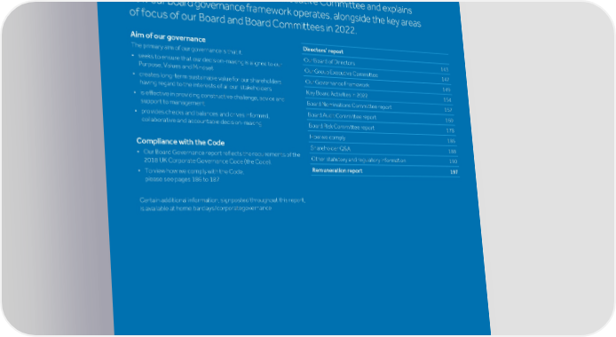 Strategic Shareholder Climate and Risk Financial Financial Barclays PLC 142 report information sustainability report Governance review review statements Annual Report 2022 Board Governance Welcome to our 2022 Board Governance report. The report sets out the composition of our Board and our Executive Committee and explains how our Board governance framework operates, alongside the key areas of focus of our Board and Board Committees in 2022. Aim of our governance Directors’ report The primary aim of our governance is that it: Our Board of Directors 143 • seeks to ensure that our decision-making is aligned to our Our Group Executive Committee 147 Purpose, Values and Mindset Our Governance Framework 149 • creates long-term sustainable value for our shareholders, having regard to the interests of all our stakeholders Key Board Activities in 2022 154 • is effective in providing constructive challenge, advice and Board Nominations Committee report 157 support to management Board Audit Committee report 169 • provides checks and balances and drives informed, collaborative and accountable decision-making. Board Risk Committee report 178 How we comply 186 Compliance with the Code Shareholder Q&A 188 • Our Board Governance report reflects the requirements of the Other statutory and regulatory information 190 2018 UK Corporate Governance Code (the Code). Remuneration report 197 • To view how we comply with the Code, please see pages 186 to 187. Certain additional information, signposted throughout this report, is available at home.barclays/corporategovernance