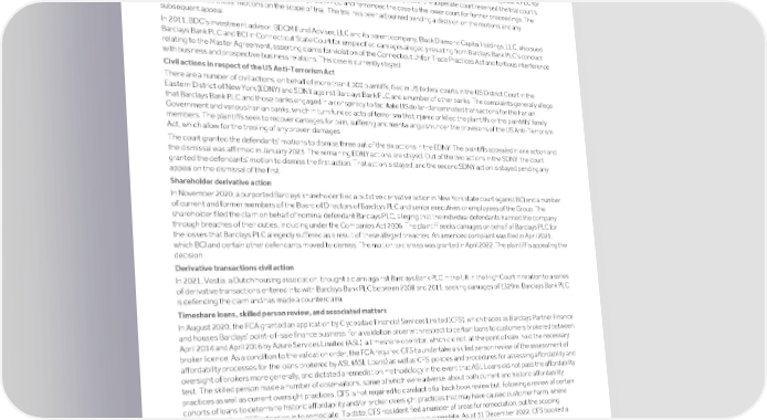 Strategic Shareholder Climate and Risk Financial Financial Barclays PLC 482 report information sustainability report Governance review review statements Annual Report 2022 Notes to the financial statements (continued) Accruals, provisions, contingent liabilities and legal proceedings BDC Finance L.L.C. In 2008, BDC Finance L.L.C. (BDC) filed a complaint in the Supreme Court of the State of New York (NY Supreme Court), demanding damages of $298m, alleging that Barclays Bank PLC had breached a contract in connection with a portfolio of total return swaps governed by an ISDA Master Agreement (the Master Agreement). Following a trial, the court ruled in 2018 that Barclays Bank PLC was not a defaulting party, which was affirmed on appeal. In April 2021, the trial court entered judgement in favour of Barclays Bank PLC for $3.3m and as yet to be determined legal fees and costs. BDC appealed. In January 2022, the appellate court reversed the trial court’s summary judgment decision in favour of Barclays Bank PLC and remanded the case to the lower court for further proceedings. The parties have filed cross-motions on the scope of trial. The trial has been adjourned pending a decision on the motions and any subsequent appeal. In 2011, BDC’s investment advisor, BDCM Fund Adviser, LLC and its parent company, Black Diamond Capital Holdings, LLC, also sued Barclays Bank PLC and BCI in Connecticut State Court for unspecified damages allegedly resulting from Barclays Bank PLC’s conduct relating to the Master Agreement, asserting claims for violation of the Connecticut Unfair Trade Practices Act and tortious interference with business and prospective business relations. This case is currently stayed. Civil actions in respect of the US Anti-Terrorism Act There are a number of civil actions, on behalf of more than 4,000 plaintiffs, filed in US federal courts in the US District Court in the Eastern District of New York (EDNY) and SDNY against Barclays Bank PLC and a number of other banks. The complaints generally allege that Barclays Bank PLC and those banks engaged in a conspiracy to facilitate US dollar-denominated transactions for the Iranian Government and various Iranian banks, which in turn funded acts of terrorism that injured or killed the plaintiffs or the plaintiffs’ family members. The plaintiffs seek to recover damages for pain, suffering and mental anguish under the provisions of the US Anti-Terrorism Act, which allow for the trebling of any proven damages. The court granted the defendants’ motions to dismiss three out of the six actions in the EDNY. The plaintiffs appealed in one action and the dismissal was affirmed in January 2023. The remaining EDNY actions are stayed. Out of the two actions in the SDNY, the court granted the defendants’ motion to dismiss the first action. That action is stayed, and the second SDNY action is stayed pending any appeal on the dismissal of the first. Shareholder derivative action In November 2020, a purported Barclays shareholder filed a putative derivative action in New York state court against BCI and a number of current and former members of the Board of Directors of Barclays PLC and senior executives or employees of the Group. The shareholder filed the claim on behalf of nominal defendant Barclays PLC, alleging that the individual defendants harmed the company through breaches of their duties, including under the Companies Act 2006. The plaintiff seeks damages on behalf of Barclays PLC for the losses that Barclays PLC allegedly suffered as a result of these alleged breaches. An amended complaint was filed in April 2021, which BCI and certain other defendants moved to dismiss. The motion to dismiss was granted in April 2022. The plaintiff is appealing the decision. Derivative transactions civil action In 2021, Vestia, a Dutch housing association, brought a claim against Barclays Bank PLC in the UK in the High Court in relation to a series of derivative transactions entered into with Barclays Bank PLC between 2008 and 2011, seeking damages of £329m. Barclays Bank PLC is defending the claim and has made a counterclaim. Timeshare loans, skilled person review, and associated matters In August 2020, the FCA granted an application by Clydesdale Financial Services Limited (CFS), which trades as Barclays Partner Finance and houses Barclays’ point-of-sale finance business, for a validation order with respect to certain loans to customers brokered between April 2014 and April 2016 by Azure Services Limited (ASL), a timeshare operator, which did not, at the point of sale, hold the necessary broker licence. As a condition to the validation order, the FCA required CFS to undertake a skilled person review of the assessment of affordability processes for the loans brokered by ASL (ASL Loans) as well as CFS’ policies and procedures for assessing affordability and oversight of brokers more generally, and dictated a remediation methodology in the event that ASL Loans did not pass the affordability test. The skilled person made a number of observations, some of which were adverse, about both current and historic affordability practices as well as current oversight practices. CFS is not required to conduct a full back book review but, following a review of certain cohorts of loans to determine historic affordability and/or broker oversight practices that may have caused customer harm, where harm is identified, CFS’ intention is to remediate. To date, CFS has identified a number of areas for remediation, but the scoping exercise is ongoing and remediation will only begin once the scoping exercise is complete. As at 31 December 2022, CFS booked a provision in respect of the expected remediation for these matters of £10.4m. Separately, and notwithstanding this, CFS decided in March 2022 to extend the proactive remediation of ASL Loans beyond those brokered between April 2014 and April 2016 to include the full portfolio of ASL Loans brokered between 2006 and 201