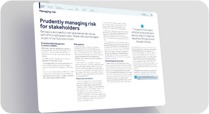 Strategic Shareholder Climate and Risk Financial Financial Barclays PLC 56 report information sustainability report Governance review review statements Annual Report 2022 Managing risk The second line of defence is made up of Risk and Compliance and oversees the first line by Prudently managing risk setting limits, rules and constraints on their To support the Group’s operations, consistent with the risk appetite. The third line of defence is comprised of Internal for stakeholders ambition to be a net zero Audit, providing independent assurance to the bank by 2050, Climate risk Board and Executive Committee on the Barclays is exposed to internal and external risks as effectiveness of governance, risk management became a Principal Risk at part of its ongoing activities. These risks are managed and control over current, systemic and evolving risks. the start of 2022. as part of our business model. The Legal function provides support to all areas of the business and is not formally part of any of Enterprise Risk Management Risk appetite the three lines of defence, The Legal function is During 2022, Barclays ran a stress test to assess Framework (ERMF) responsible for the identification of all legal and Risk appetite defines the level of risk we are its capital adequacy and resilience under a severe regulatory risks. Except in relation to the legal prepared to accept across the different risk At Barclays, risks are identified and overseen in but plausible macroeconomic scenario. The advice it provides or procures, it is subject to types, taking into consideration varying levels of accordance with the ERMF, which supports the internal stress test was informed by the Bank of second line oversight with respect to its own financial and operational stress. Risk appetite is business in its aim to embed effective risk England 2022 regulatory stress test featuring operational and conduct risks, as well as with key to our decision-making processes, including management and a strong risk management high and persistent inflation, rising global interest respect to the legal and regulatory risks to which ongoing business planning and setting of culture. rates, a severe UK recession brought by falling the Group is exposed. strategy, new product approvals and business household real incomes, job losses leading to a The ERMF governs the way in which Barclays change initiatives. high unemployment rate, energy and cost of Monitoring the risk profile identifies and manages its risks. The Group sets its risk appetite in terms of goods shocks, increasing corporate defaults, and Together with a strong governance process, The management of risk is then embedded into performance metrics as well as a set of mandate severe house and real estate price shocks. For using business and Group level Risk Committees each level of the business, with all colleagues and scale limits to monitor risks (i.e. to ensure further details of the stress test, please refer to as well as Board level forums, the Board receives being responsible for identifying and controlling business activities are aligned with expectations page 59. regular information in respect of the risk profile of risk. and are of an appropriate scale relative to the risk the Group, and has ultimate responsibility for We believe that our structure and governance Given the increasing risks associated with climate and reward of the underlying activities). During Group risk appetite and capital plans. Information supports us in managing risk in the changing change, and to support the Group’s ambition to 2022, the Group’s performance remained within received includes measures of risk profile against economic, political and market environments. be a net zero bank by 2050, Climate risk became its risk appetite limits. risk appetite as well as the identification of new For further detailed analysis of approach to risk a Principal Risk at the start of 2022. + management and risk performance, please see our full Risk and emerging risks, which are derived by Three lines of defence review on pages 266 to 377 of Part 3 of the Annual Report mapping risk drivers, identified through horizon The first line of defence is comprised of the scanning, to risk themes, and similar analysis. revenue-generating and client-facing areas, along with all associated support functions, including Finance, Treasury, Human Resources and Operations and Technology. The first line identifies the risks, sets the controls and escalates risk events to the second line of defence. Employees in the first line have primary responsibility for their risks and their activities are subject to oversight from the relevant parts of the second and third lines.