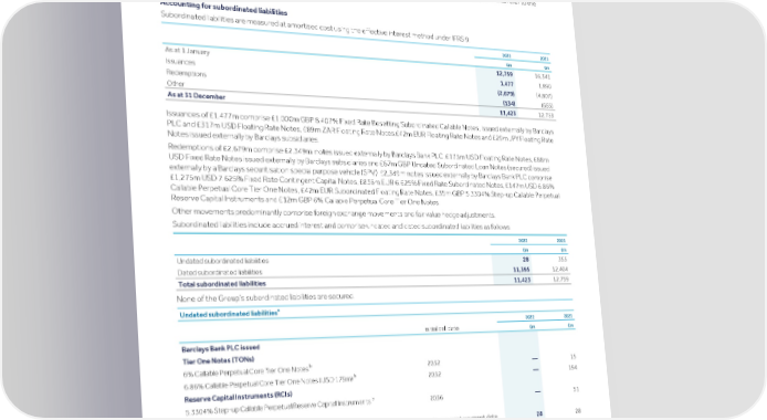 Strategic Shareholder Climate and Risk Financial Financial Barclays PLC 485 report information sustainability report Governance review review statements Annual Report 2022 Notes to the financial statements (continued) Capital instruments, equity and reserves Capital instruments, equity and reserves The notes included in this section focus on the Group’s loan capital and shareholders’ equity including issued share capital, retained earnings, other equity balances and interests of minority shareholders in our subsidiary entities (non-controlling interests). For more information on capital management and how the Group maintains sufficient capital to meet our regulatory requirements refer to the Capital risk management section. 27 Subordinated liabilities Accounting for subordinated liabilities Subordinated liabilities are measured at amortised cost using the effective interest method under IFRS 9. 2022 2021 £m £m As at 1 January 12,759 16,341 Issuances 1,477 1,890 Redemptions (2,679) (4,807) Other (134) (665) As at 31 December 11,423 12,759 Issuances of £1,477m comprise £1,000m GBP 8.407% Fixed Rate Resetting Subordinated Callable Notes, issued externally by Barclays PLC and £317m USD Floating Rate Notes, £89m ZAR Floating Rate Notes,£42m EUR Floating Rate Notes and £29m JPY Floating Rate Notes issued externally by Barclays subsidiaries. Redemptions of £2,679m comprise £2,349m notes issued externally by Barclays Bank PLC, £175m USD Floating Rate Notes, £88m USD Fixed Rate Notes issued externally by Barclays subsidiaries and £67m GBP Undated Subordinated Loan Notes (secured) issued externally by a Barclays securitisation special purpose vehicle (SPV). £2,349m notes issued externally by Barclays Bank PLC comprise £1,275m USD 7.625% Fixed Rate Contingent Capital Notes, £838m EUR 6.625% Fixed Rate Subordinated Notes, £147m USD 6.86% Callable Perpetual Core Tier One Notes, £42m EUR Subordinated Floating Rate Notes, £35m GBP 5.3304% Step-up Callable Perpetual Reserve Capital Instruments and £12m GBP 6% Callable Perpetual Core Tier One Notes. Other movements predominantly comprise foreign exchange movements and fair value hedge adjustments. Subordinated liabilities include accrued interest and comprise undated and dated subordinated liabilities as follows: 2022 2021 £m £m Undated subordinated liabilities 28 355 Dated subordinated liabilities 11,395 12,404 Total subordinated liabilities 11,423 12,759 None of the Group’s subordinated liabilities are secured. a Undated subordinated liabilities 2022 2021 Initial call date £m £m Barclays Bank PLC issued Tier One Notes (TONs) b 6% Callable Perpetual Core Tier One Notes 2032 15 — b 6.86% Callable Perpetual Core Tier One Notes (USD 179m) 2032 194 — Reserve Capital Instruments (RCIs) b 5.3304% Step-up Callable Perpetual Reserve Capital Instruments 51 2036 — Undated Notes Junior Undated Floating Rate Notes (USD 38m) Any interest payment date 28 28 Barclays securitisation SPV issued Undated Subordinated Loan Notes (secured) Undated Subordinated Loan Notes (secured) (GBP 67m) At any time 67 — Total undated subordinated liabilities 355 28 Notes a Instrument values are disclosed to the nearest million. b The GBP 6% Callable Perpetual Core Tier One Notes, USD 6.86% Callable Perpetual Core Tier One Notes and GBP 5.3304% Step-up Callable Perpetual Reserve Capital Instruments were redeemed by exercising a regulatory call option in 2022.