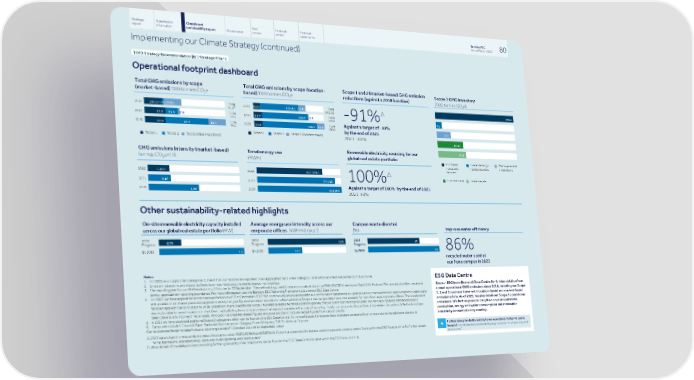 Strategic Shareholder Climate and Risk Financial Financial Barclays PLC 80 report information sustainability report Governance review review statements Annual Report 2022 Implementing our Climate Strategy (continued) TCFD Strategy Recommendation (b) | Strategic Pillar 1 Operational footprint dashboard Total GHG emissions by scope Total GHG emissions by scope (location- Scope 1 and 2 (market-based) GHG emission Scope 3 GHG inventory based) ‘000 tonnes CO e reductions (against a 2018 baseline) (market-based) ‘000 tonnes CO e 2 2 ('000 tonnes CO e) 2 Total Total 2022 2022 20.0△1.9△19.4△ 20.0△ 103.4△ 19.4△ △ 599.2 41.3 142.9△ △ Total Total -91% 23.2 13.6 2.4 23.2 124.2 2.4 2021 2021 39.2 149.8 4.6 Total Total Against a target of -90% 2020 2020 22.8 48.3 19.1 22.8 148.7 19.1 90.2 190.6 10.7 by the end of 2025 Scope 1 Scope 2 Scope 3 (Business travel) n n n 2021: -86% Scope 1 Scope 2 Scope 3 (Business travel) n n n 19.4△ 21.1 Renewable electricity sourcing for our GHG emissions intensity (market-based) Total energy use global real estate portfolio tonnes CO e/FTE (MWh) 2 Purchased Fuel and energy- Waste generated n n n goods and related activities in operations services 2022 2022 0.47△ 467,939△ △ Business travel Leased assets n n 100% 2021 0.48 559,241 2021 Against a target of 100% by the end of 2025 2020 2020 1.09 604,856 2021: 94% Other sustainability-related highlights Campus waste diverted On-site renewable electricity capacity installed Average energy use intensity across our Improve water efficiency across our global real estate portfolio (MW) corporate offices (kWh/m2/year) (%) 2022 2022 2022 0.26 265 65 Progress Progress Progress 86% By 2035 By 2035 10 115 90 By 2035 recycled water used at our Pune campus in 2022 Notes 1. For 2022, our Supply chain categories 1, 2 and 4 GHG emissions are reported on an aggregated basis under Category 1 and will be reported independently in due course. ESG Data Centre 2. Emission reductions and intensities have been reported using the market based methodology. 3. The reporting year for our GHG emissions is 1 October to 30 September. The methodology used for emissions calculation is the WRI/ WBCSD Greenhouse Gas (GHG) Protocol. We have adopted the operational See our ESG (non-financial) Data Centre for further details of our control approach on reporting boundaries. For more information, see the Barclays ESG Reporting Framework 2022 on our ESG Data Centre annual operational GHG emissions since 2018, including our Scope 4. For 2022, we have applied the latest emission factors as of 31st December 2022. We continuously review and update our performance data based on updated carbon emission factors, improvements in data quality 1, 2 and 3 business travel with location-based and market-based and updates to estimates previously applied. In 2022 prior year figures have been restated to reflect additional Scope 1 natural gas data that is now available for two of our large corporate offices. The restatement emissions data. As of 2022, we also detail our Scope 3 operational has been applied to all prior years to 2018. In addition, there is additional Scope 1 fuel data available for three locations globally that were not reported in prior years. We have also replaced estimated Scope 2 emissions. We further provide insights on our annual waste electricity data for select locations in the US with actual billing from utility providers that was not available at the time of reporting. Finally, corrections to Scope 2 electricity data in Switzerland & Netherlands have production, energy and water consumption and renewable taken place due to incorrect meter reads. All location and market-based figures are gross and do not include netted figures from carbon credits. 5. In 2022 we have disclosed additional Scope 3 categories which can be found in the ESG Data Centre. Our overall Scope 3 emissions have increased compared to prior years due to the additional disclosure. electricity consumption by country. 6. Campuses include 1 Churchill Place, Radbroke, Northampton, Glasgow, Pune, Whippany, 745 7th Avenue, Dryrock Our operational footprint data follows a reporting period of 1 October 2021 to 30 September 2022 Further data granularity relating to our operational footprint can be Δ 2022 data subject to independent Limited Assurance under ISAE(UK)3000 and ISAE3410. Current and previous limited assurance scope and opinions can be found within the ESG Resource Hub for further details: + found at: home.barclays/sustainability/esg-resource-hub/reporting-and- home.barclays/sustainability/esg-resource-hub/reporting-and-disclosures/ disclosures/ Further details of the data provided, including further granularity of decimal points can be found in the ESG Data Centre located within the ESG Resource Hub.