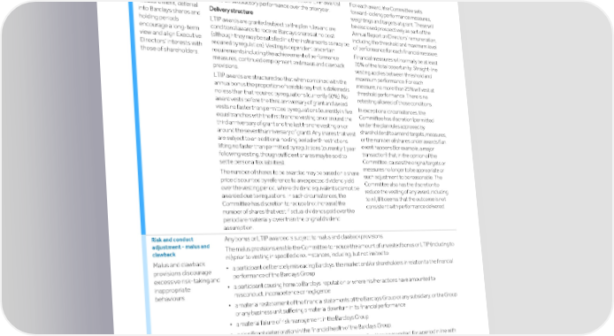 Strategic Shareholder Climate and Risk Financial Financial Barclays PLC 211 report information sustainability report Governance review review statements Annual Report 2022 Remuneration report (continued) Element and purpose Operation Maximum value and performance measures Long Term Incentive Plan Determination of LTIP award The maximum annual LTIP award for the (LTIP) award Group Chief Executive is 140% of Fixed Pay LTIP awards are determined by the Committee following To incentivise execution and 134% of Fixed Pay for the Group discussion of recommendations made by the Chairman (for of Barclays’ strategy Finance Director. the Group Chief Executive’s LTIP award) and by the Group over a multi-year period. For each award, the Committee sets Chief Executive (for other Executive Directors’ LTIP awards) Long-term performance based on satisfactory performance over the prior year. forward-looking performance measures, measurement, deferral weightings and targets at grant. These will Delivery structure into Barclays shares and be disclosed prospectively as part of the LTIP awards are granted subject to the plan rules and are holding periods Annual Report on Directors’ remuneration, conditional awards to receive Barclays shares at no cost encourage a long-term including the threshold and maximum level (although they may be satisfied in other instruments as may be view and align Executive of performance for each financial measure. required by regulation). Vesting is dependent on certain Directors’ interests with Financial measures will normally be at least requirements including the achievement of performance those of shareholders. 70% of the total opportunity. Straight-line measures, continued employment and malus and clawback vesting applies between threshold and provisions. maximum performance. For each LTIP awards are structured so that when combined with the measure, no more than 25% will vest at annual bonus the proportion of variable pay that is deferred is threshold performance. There is no no less than that required by regulations (currently 60%). No retesting allowed of those conditions. award vests before the third anniversary of grant and award In exceptional circumstances, the vests no faster than permitted by regulations (currently in five Committee has discretion (permitted equal tranches with the first tranche vesting on or around the under the plan rules approved by third anniversary of grant and the last tranche vesting on or shareholders) to amend targets, measures, around the seventh anniversary of grant). Any shares that vest or the number of shares under awards if an are subject to an additional holding period with restrictions event happens (for example, a major lifting no faster than permitted by regulations (currently 1 year transaction) that, in the opinion of the following vesting, though sufficient shares may be sold to Committee, causes the original targets or settle personal tax liabilities). measures no longer to be appropriate or The number of shares to be awarded may be based on a share such adjustment to be reasonable. The price discounted by reference to an expected dividend yield Committee also has the discretion to over the vesting period, where dividend equivalents cannot be reduce the vesting of any award, including awarded due to regulations. In such circumstances, the to nil, if it deems that the outcome is not Committee has discretion to reduce (not increase) the consistent with performance delivered. number of shares that vest if actual dividends paid over the period are materially lower than the original dividend assumption. Risk and conduct Any bonus or LTIP awarded is subject to malus and clawback provisions. adjustment - malus and The malus provisions enable the Committee to reduce the amount of unvested bonus or LTIP (including to clawback nil) prior to vesting in specified circumstances, including, but not limited to: Malus and clawback ▪ a participant deliberately misleading Barclays, the market and/or shareholders in relation to the financial provisions discourage performance of the Barclays Group excessive risk-taking and ▪ a participant causing harm to Barclays’ reputation or where his/her actions have amounted to inappropriate misconduct, incompetence or negligence behaviours. ▪ a material restatement of the financial statements of the Barclays Group or any subsidiary, or the Group or any business unit suffering a material downturn in its financial performance ▪ a material failure of risk management in the Barclays Group ▪ a significant deterioration in the financial health of the Barclays Group. The clawback provisions enable amounts to be recovered after they have vested, for a period in line with applicable regulation – currently seven years from grant (which can be extended to up to ten years in circumstances where a relevant investigation is ongoing at the end of the initial seven-year period) where (i) a participant’s actions or omissions have amounted to misbehaviour or material error and/or (ii) Barclays or the relevant business unit has suffered a material failure of risk management.