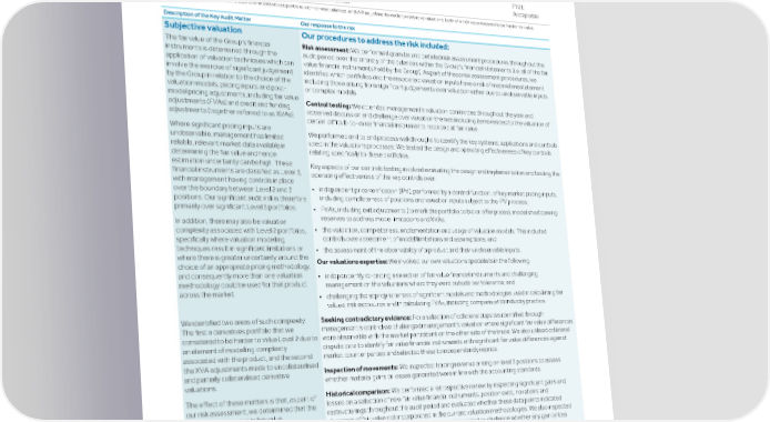 Strategic Shareholder Climate and Risk Financial Financial Barclays PLC 405 report information sustainability report Governance review review statements Annual Report 2022 KPMG LLP’s independent auditor’s report to the members of Barclays PLC (continued) 4.2 Valuation of financial instruments held at fair value Financial Statement Elements FY22 FY21 Our assessment of risk vs FY21 Our results Level 2 assets at fair value* (note 17) £595bn £533bn FY22: 1 Our assessment is that the risk is similar to FY21. Acceptable Level 2 liabilities at fair value* (note 17) £572bn £521bn FY21: Level 3 assets at fair value (note 17) £21bn £16bn Acceptable Level 3 liabilities at fair value (note 17) £7.5bn £6.5bn *The key audit matter identified relates to one derivatives portfolio within these balances, and xVA adjustments made to derivative valuations, both of which we considered to be harder-to-value. Description of the Key Audit Matter Our response to the risk Subjective valuation Our procedures to address the risk included: The fair value of the Group’s financial Risk assessment: We performed granular and detailed risk assessment procedures throughout the instruments is determined through the audit period over the entirety of the balances within the Group’s financial statements (i.e. all of the fair application of valuation techniques which can value financial instruments held by the Group). As part of these risk assessment procedures, we involve the exercise of significant judgement identified which portfolios and the associated valuation inputs have a risk of material misstatement by the Group in relation to the choice of the including those arising from significant judgements over valuation either due to unobservable inputs valuation models, pricing inputs and post- or complex models. model pricing adjustments, including fair value Control testing: We attended management’s valuation committee throughout the year and adjustments (FVAs) and credit and funding observed discussion and challenge over valuation themes including items related to the valuation of adjustments (together referred to as XVAs). certain difficult-to-value financial instruments recorded at fair value. Where significant pricing inputs are We performed end to end process walkthroughs to identify the key systems, applications and controls unobservable, management has limited used in the valuations processes. We tested the design and operating effectiveness of key controls reliable, relevant market data available in relating specifically to these portfolios. determining the fair value and hence estimation uncertainty can be high. These Key aspects of our controls testing involved evaluating the design and implementation and testing the financial instruments are classified as Level 3, operating effectiveness of the key controls over: with management having controls in place • independent price verification (IPV), performed by a control function, of key market pricing inputs, over the boundary between Level 2 and 3 including completeness of positions and valuation inputs subject to the IPV process; positions. Our significant audit risk is therefore primarily over significant Level 3 portfolios. • FVAs, including exit adjustments (to mark the portfolio to bid or offer prices), model shortcoming reserves to address model limitations and XVAs; In addition, there may also be valuation • the validation, completeness, implementation and usage of valuation models. This included complexity associated with Level 2 portfolios, controls over assessment of model limitations and assumptions; and specifically where valuation modelling techniques result in significant limitations or • the assessment of the observability of a product and their unobservable inputs. where there is greater uncertainty around the Our valuations expertise: We involved our own valuations specialists in the following: choice of an appropriate pricing methodology, and consequently more than one valuation • independently re-pricing a selection of fair value financial instruments and challenging methodology could be used for that product management on the valuations where they were outside our tolerance; and across the market. • challenging the appropriateness of significant models and methodologies used in calculating fair values, risk exposures and in calculating FVAs, including comparison to industry practice. We identified two areas of such complexity. Seeking contradictory evidence: For a selection of collateral disputes identified through The first a derivatives portfolio that we management’s control we challenged management’s valuation where significant fair value differences considered to be harder to value Level 2 due to were observable with the market participant on the other side of the trade. We also utilised collateral an element of modelling complexity dispute data to identify fair value financial instruments with significant fair value differences against associated with the product, and the second market counter parties and selected these to independently reprice. the XVA adjustments made to uncollateralised Inspection of movements: We inspected trading revenue arising on level 3 positions to assess and partially collateralised derivative whether material gains or losses generated were in line with the accounting standards. valuations. Historical comparison: We performed a retrospective review by inspecting significant gains and The effect of these matters is that, as part of losses on a selection of new fair value financial instruments, position exits, novations and our risk assessment, we determined that the restructurings throughout the audit period and evaluated whether these data points indicated subjective estimates in fair value elements of fair value not incorporated in the current valuation methodologies. We also inspected measurement of certain portfolios, and movements in unobservable inputs throughout the period to 