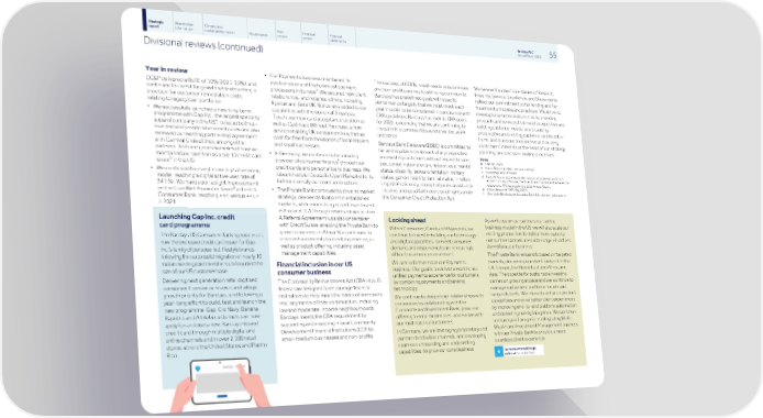 Strategic Shareholder Climate and Risk Financial Financial Barclays PLC 55 report information sustainability report Governance review review statements Annual Report 2022 Divisional reviews (continued) • Our Payments business maintained its The success of CDFIs, small-medium businesses We believe Barclays’ core Values of Respect, Year in review position as one of the foremost payment and non-profits are key to a thriving community. Integrity, Service, Excellence, and Stewardship CC&P delivered a RoTE of 10% (2021: 15%), and e processors in Europe . We secured new client Barclays has predefined goals with specific reflect our commitment to fair lending and fair continued to invest for growth while absorbing a relationships, and retained others, including performance targets that we must meet each treatment principles and practices. We strive to provision for customer remediation costs Ryanair and Getir UK. We’ve also added to our year in order to be considered in compliance with develop long-term relationships by providing relating to legacy loan portfolios. capabilities with the launch of Smartpay CRA guidelines. Barclays has met its CRA goals products and services that meet prospective and ▪ We successfully launched a new long-term Touch, our new card acceptance solution as for 2022, evidencing that we are continuing to existing customer needs, avoid causing programme with Gap Inc., the largest specialty a well as Cashback Without Purchase, a new invest in the communities where we live, work prospective and existing customer detriment or apparel company in the US , to issue both co- service enabling UK consumers to withdraw and serve. harm, and place our prospective and existing branded and private label credit cards and also cash for free from thousands of local retailers customers' interests at the heart of our strategy, renewed our existing partnership agreement Barclays Bank Delaware (BBDE) is committed to with Carnival Cruise Lines, among other and small businesses. planning, and decision-making processes. fair and equitable treatment of all prospective partners. Both are good examples of how we Notes ▪ In Germany, we continue to be a leading and existing customers without regard to race, a Gap Inc., 2020. maintained our position as a top 10 credit card f provider of consumer finance through our sex, colour, national origin, religion, age, marital b b Nilson Report #1204 (mid-year ranking). issuer in the US. c Excluding Cap customers. credit cards and personal loans business. We status, disability, sexual orientation, military d Care tNPS provides an accurate measure of customer sentiment ▪ We continued to invest in our digital servicing relaunched our Deposits Open Market offer to status, gender identity, familial status, Limited across our Fraud, Dispute, Credit and Care channels and replaces the model, reaching a digital active user rate of relationship NPS reported in the 2021 Annual Report. further diversify our revenue structure. English Proficiency, receipt of public assistance c 74.1% . We have seen a slight improvement e Nilson Report #1197 (May 2022). d income, and good faith exercise of rights under f Deutsche Bundesbank, Advanzia Bank S.A., plus own calculations. ▪ The Private Bank continued to drive its market on the Care Net Promoter Score in the US the Consumer Credit Protection Act. Consumer Bank, reaching +44, versus +43.4 strategy, deepen its footprint in established in 2021. markets, while monetising recent investments in Asia and EEA through new client acquisition. A Referral Agreement was also undertaken Launching Gap Inc. credit As we focus on our partnership-centric Looking ahead with Credit Suisse, enabling the Private Bank to business model in the US, we will also scale our card programme Within Consumer, Cards and Payments, we grow its business in Africa. We continued to existing proposition to deliver more value to continue to invest in building our technology The Barclays US Consumer Banking business is drive enhancements to client experience, as our partners across a broader range of sectors, and digital capabilities, to meet consumer now the exclusive credit card issuer for Gap well as product offering, including asset diversifying our business. demand and responding to an increasingly Inc.’s family of purpose-led, lifestyle brands management capabilities. difficult economic environment. The Private Bank remains focused on targeted following the successful migration of nearly 10 markets, deepening our client footprint in the million existing card members and doubled the We aim to further scale our Payments Financial inclusion in our US UK, Europe, the Middle East and Africa, and business. Our goal is to deliver a world-class size of our US customer base. consumer business Asia. The appetite for sustainable investing unified payments experience for customers, Delivering next generation retail digitised The Community Reinvestment Act (CRA) is a US by combining payments and banking carries on growing at pace and we continue to consumer financial services is a strategic federal law designed to encourage financial technology. manage sustainable portfolios for a broad growth priority for Barclays, and following a institutions to help meet the needs of borrowers range of clients. We intend to enhance product We continue to deepen our relationships with year-long effort to build, test and launch the in all segments of their communities, including capabilities and drive better client experiences corporates by collaborating with the new programme, Gap, Old Navy, Banana low and moderate-income neighbourhoods. by improving end-to-end platform automation Corporate and Investment Bank; grow our Republic and Athleta customers can now Barclays meets the CRA requirement by and delivering our digital agenda. We continue offering to small businesses; and evolve with apply for and use a new, Barclays-issued supporting and investing in local Community to ma