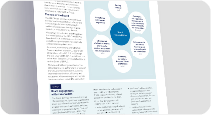 Strategic Shareholder Climate and Risk Financial Financial Barclays PLC 150 report information sustainability report Governance review review statements Annual Report 2022 Directors’ report: Our Governance Framework (continued) Corporate Governance How the Board discharged its responsibilities in 2022 Operating Manual Our Corporate Governance Operating Manual sets out how the Group’s entities (and their respective Boards and Board Committees) should interact with each other, while also providing guidance and clarity for management and Directors as to how these relationships and processes should work in practice. This is a dynamic document that continues to evolve with the changing nature of the Group. The role of the Board The BPLC Board sets the purpose, strategic direction and risk appetite for the Group and is the ultimate decision-making body for matters of Group-wide strategic, financial, regulatory or reputational significance. We partially consolidated and streamlined the membership of the BPLC and BBPLC Boards in 2019, to improve coordination and efficiency while reducing complexity and unnecessary duplication. As a result, membership of the BBPLC Board is a subset of the BPLC Board, with all members of the BPLC Board (except the SID, Chair of BBUKPLC and at least one other Non-Executive Director) also serving on the Board of BBPLC. We believe that having members of the BPLC Board serve as the Chairs of some of the Group’s main subsidiaries supports improved coordination, efficiency and escalation, whilst enabling an appropriate focus on matters relevant to each entity. Spotlight Board members also participated in • the Group Chief Executive held Board engagement events with other stakeholders. engagement sessions with with stakeholders These engagements bring valuable colleagues, including quarterly The Board strongly believes in the value outside perspectives to the Board. Group results town halls, Business of engaging directly with our stakeholders and Function town halls, and Other Board engagement with and in 2022 Board members continued to Employee Resource Group stakeholders in 2022 included: engage with our shareholders, including sessions extensive engagement by our Chairman • a site visit to the Barclays Radbroke • the Group Finance Director and SID ahead of the 2022 AGM. The campus to meet colleagues and participated in colleague events, Chairman also met with institutional explore first-hand their skills, including during Multi-Generational investors throughout the course of the experience and career aspirations Week and Women in Junior year, and the Group Chief Executive and • the Board held a reception with Banking events. She also met with Group Finance Director held briefings senior female leaders in New York, environmentally-focused with investors at each set of quarterly together with members from the companies that Barclays is results. Boards of Barclays US LLC and supporting The Board recognises that our colleagues Barclays Bank Delaware • Mohamed A. El-Erian, Dawn are critical to our success, and our • the Chairman, Tim Breedon and Fitzpatrick and Brian Gilvary continued investment in them protects Crawford Gillies facilitated a Lifeskills participated in various colleague and strengthens our culture. In addition workshop at a London school and client events. to receiving formal updates about colleague engagement and sentiment, Further information about how we engage with + the Board also met colleagues to hear stakeholders can be found in the Strategic Report on pages 21 to 22. their feedback at various events held during the year.