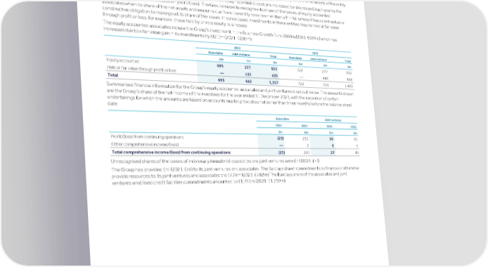 Strategic Shareholder Climate and Risk Financial Financial Barclays PLC 506 report information sustainability report Governance review review statements Annual Report 2022 Notes to the financial statements (continued) Scope of consolidation 36 Investments in associates and joint ventures Accounting for associates and joint ventures The Group applies IAS 28 Investments in Associates and IFRS 11 Joint Arrangements. Associates are entities in which the Group has significant influence, but not control, over the operating and financial policies. Generally the Group holds more than 20% but less than 50% of their voting shares. Joint ventures are arrangements where the Group has joint control and rights to the net assets of the entity. The Group’s investments in associates and joint ventures are initially recorded at cost and increased (or decreased) each year by the Group’s share of the post acquisition profit/(loss). The Group ceases to recognise its share of the losses of equity accounted associates when its share of the net assets and amounts due from the entity have been written off in full, unless it has a contractual or constructive obligation to make good its share of the losses. In some cases, investments in these entities may be held at fair value through profit or loss, for example, those held by private equity businesses. The equity accounted associates include the Group's investment in the Business Growth Fund £669m (2021: £699m) which has increased due to a fair value gain in its investments by £(21)m (2021: £220m). 2022 2021 Associates Joint ventures Total Associates Joint ventures Total £m £m £m £m £m £m Equity accounted 695 227 922 722 277 999 Held at fair value through profit or loss — 435 435 — 444 444 Total 695 662 1,357 722 721 1,443 Summarised financial information for the Group’s equity accounted associates and joint ventures is set out below. The amounts shown are the Group’s share of the net income of the investees for the year ended 31 December 2021, with the exception of certain undertakings for which the amounts are based on accounts made up to dates not earlier than three months before the balance sheet date. Associates Joint ventures 2022 2021 2022 2021 £m £m £m £m Profit/(loss) from continuing operations (21) 219 26 35 Other comprehensive income/(loss) — 1 1 5 Total comprehensive income/(loss) from continuing operations (21) 220 27 40 Unrecognised shares of the losses of individually immaterial associates and joint ventures were £nil (2021: £nil). The Group has provided £nil (2021: £nil) to its joint ventures and associates. The Barclays drawn commitments to finance or otherwise provide resources to its joint ventures and associates are £474m (2021: £482m) The Barclays share of the associates and joint ventures unutilised credit facilities commitments amounted to £1,796m (2021: £1,760m).