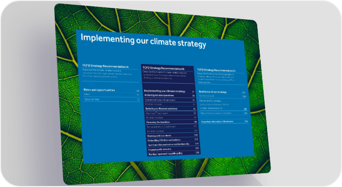 Implementing our climate strategy TCFD Strategy Recommendation A: TCFD Strategy Recommendation B: TCFD Strategy Recommendation C: Describe the climate-related risks and Describe the impact of climate-related risks and Describe the resilience of the organisation’s opportunities the organisation has identified over opportunities on the organisation’s businesses, strategy, taking into consideration different the short, medium, and long term. strategy, and financial planning. climate-related scenarios, including a 2°C or lower scenario. Risks and opportunities Implementing our climate strategy Resilience of our strategy 73 77 127 Risks 74 Achieving net zero operations 78 Scenario analysis 128 Opportunities 76 Operational footprint dashboard 80 Resilience of our strategy, All other narrative 81 taking into consideration different climate-related scenarios Reducing our financed emissions 85 135 TM BlueTrack dashboard 88 Macro-dependencies and objectives 135 All other narrative 89 Financing the transition 99 Important information / disclaimers 136 Sustainable finance dashboard 101 All other narrative 102 Working with our clients 103 Embedding ESG into our business 117 Just transition and nature and biodiversity 119 Engaging with industry 122 Barclays' approach to public policy 126
