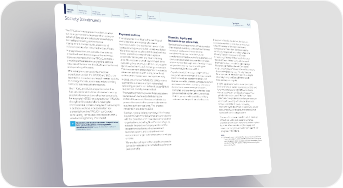 Strategic Shareholder Climate and Risk Financial Financial Barclays PLC 44 report information sustainability report Governance review review statements Annual Report 2022 Society (continued) The TPCoC encourages our suppliers to adopt In support of the GSD initiative, Barclays is a Payment on time Diversity, Equity and our approach to doing business when acting on corporate member of, and plays an important Inclusion in our value chain Prompt payment is critical to the cash flow of behalf of Barclays and details our expectations role with, several of the most prominent every business, and especially to smaller Barclays believes that diversity across our value for matters including environmental domestic and international diverse supplier businesses within the supply chain as cash flow chain expands our ability to attract and harness management, human rights, diversity and certification organisations including National issues are a major contributor to business failure. innovative solutions in the market that inclusion and also for living the Barclays Values. Minority Supplier Development Council We aim to pay our suppliers within clearly defined complement our own capabilities, while (nmsdc.org), Women’s Business Enterprise Managed suppliers are asked to complete an terms, and to help ensure there is a proper simultaneously creating value for customers and National Council (wbenc.org), WeConnect annual self-certification against the individual process for dealing with any issues that may clients, and economic opportunities for wider, International (weconnectinternational.org), topics contained within the TPCoC, as well as arise. We measure prompt payment globally by under-represented segments of society. This is National LGBTQ Chamber of Commerce providing annual assurance that the controls calculating the percentage of third-party supplier why we launched our first Global Supplier (nglcc.org), National Veteran Owned Businesses required of them under the SCOs are maintained spend paid within 45 days following invoice date. Diversity (GSD) initiative in 2013. Association (NaVoba.org), Minority Supplier and operating effectively. The measurement applies against all invoices by As part of our GSD initiative in 2022, 8.5% of Development UK (msduk.org.uk), Disability:IN value over a three-month rolling period for all a Where suppliers are unable to meet our our global addressable spend was placed with (disabilityIn.org) and Social Enterprise UK entities where invoices are managed centrally. expectations under the TPCOC and SCOs, the small and medium-sized enterprises and (socialenterprise.org.uk). issue will be escalated and we will look for options In 2022, we achieved 93% (2021: 90%) on-time diverse-owned businesses as measured by first- In 2021, we pledged to double our spend with to manage the risk, which may include electing payment to our suppliers (by invoice value), and second-tier direct spending. Ownership- black and female-owned businesses by 2025 and not to do business with the supplier. exceeding our public commitment to pay 85% of diverse businesses are majority owned, to grow overall spend with SMEs and diverse- suppliers on time (by invoice value). controlled and operated by protected class The TPCoC and SCOs are published on the owned businesses to 10% of Barclays annual groups, such as women, ethnic minorities, Barclays public website for all new and existing The need to promptly pay our diverse suppliers global addressable spend. We have made LGBT+, persons with disabilities, military suppliers to view and are refreshed periodically. became even more important during the structural changes to improve how we measure veterans and for-profit social enterprises. For example in 2022, we upgraded our TPCoC to COVID-19 pandemic. Barclays established a and report spending with diverse, Black and strengthen the expectations relating to process to expedite the payments for diverse female-owned businesses, increasing environmental, climate change and human rights. suppliers at this critical time. This process transparency to stakeholders and driving greater In addition, we have included certain key remained in place during 2022. accountability with those authorised to direct elements from the TPCoC in our General Barclays is proud to be a signatory of the Prompt spend with third-party providers. Contracting Terms used with suppliers with a Payment Code in the UK and we also work closely view to strengthening their impact. The aim is for service providers, which make up with the Small Business Commissioner and other 70% of our addressable spend, to have a Please see further details on our climate change initiatives organisations, including Good Business Pays, to + diversity and inclusion policy or standard in place in our supply chain within our Achieving net zero educate the public on late payments and the operations section from page 78 within the Climate and by 2025. We are continuing to engage and Sustainability report. impact they can have on businesses and assess our suppliers and will report against our business owners, and to raise the social progress in the future. conscience of larger businesses who do not pay Note on time. a Addressable spend is defined as external costs incurred by Barclays in the normal course of business where Procurement has influence over We are also calling on other large businesses to where the spend is placed. It excludes costs such as regulatory fines or join us to make sure their smallest suppliers are charges, exchange fees, taxation, employee expenses or litigation costs, property rent. paid promptly.