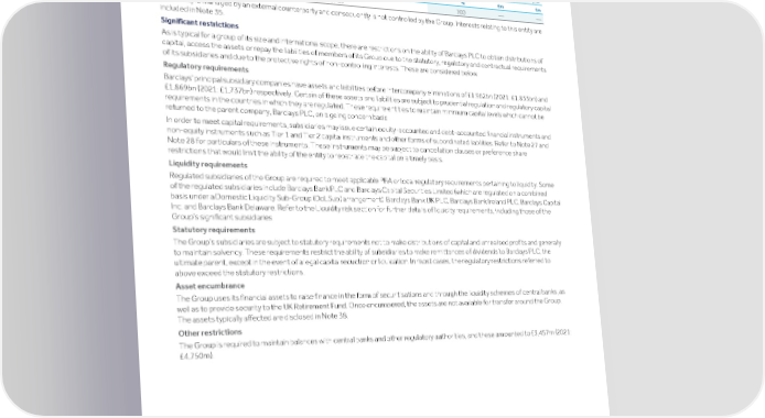 Strategic Shareholder Climate and Risk Financial Financial Barclays PLC 501 report information sustainability report Governance review review statements Annual Report 2022 Notes to the financial statements (continued) Scope of consolidation An interest in equity voting rights exceeding 50% would typically indicate that the Group has control of an entity. However, the entity set out below is excluded from consolidation because the Group does not have exposure to its variable returns. Equity Percentage of shareholders' Retained profit for voting rights held funds the year Company name Country of registration or incorporation % £m £m Palomino Limited Cayman Islands 100 — — This entity is managed by an external counterparty and consequently is not controlled by the Group. Interests relating to this entity are included in Note 35. Significant restrictions As is typical for a group of its size and international scope, there are restrictions on the ability of Barclays PLC to obtain distributions of capital, access the assets or repay the liabilities of members of its Group due to the statutory, regulatory and contractual requirements of its subsidiaries and due to the protective rights of non-controlling interests. These are considered below. Regulatory requirements Barclays’ principal subsidiary companies have assets and liabilities before intercompany eliminations of £1,962bn (2021: £1,833bn) and £1,869bn (2021: £1,737bn) respectively. Certain of these assets and liabilities are subject to prudential regulation and regulatory capital requirements in the countries in which they are regulated. These require entities to maintain minimum capital levels which cannot be returned to the parent company, Barclays PLC, on a going concern basis. In order to meet capital requirements, subsidiaries may issue certain equity-accounted and debt-accounted financial instruments and non-equity instruments such as Tier 1 and Tier 2 capital instruments and other forms of subordinated liabilities. Refer to Note 27 and Note 28 for particulars of these instruments. These instruments may be subject to cancellation clauses or preference share restrictions that would limit the ability of the entity to repatriate the capital on a timely basis. Liquidity requirements Regulated subsidiaries of the Group are required to meet applicable PRA or local regulatory requirements pertaining to liquidity. Some of the regulated subsidiaries include Barclays Bank PLC and Barclays Capital Securities Limited (which are regulated on a combined basis under a Domestic Liquidity Sub-Group (DoLSub) arrangement), Barclays Bank UK PLC, Barclays Bank Ireland PLC, Barclays Capital Inc. and Barclays Bank Delaware. Refer to the Liquidity risk section for further details of liquidity requirements, including those of the Group’s significant subsidiaries. Statutory requirements The Group’s subsidiaries are subject to statutory requirements not to make distributions of capital and unrealised profits and generally to maintain solvency. These requirements restrict the ability of subsidiaries to make remittances of dividends to Barclays PLC, the ultimate parent, except in the event of a legal capital reduction or liquidation. In most cases, the regulatory restrictions referred to above exceed the statutory restrictions. Asset encumbrance The Group uses its financial assets to raise finance in the form of securitisations and through the liquidity schemes of central banks, as well as to provide security to the UK Retirement Fund. Once encumbered, the assets are not available for transfer around the Group. The assets typically affected are disclosed in Note 38. Other restrictions The Group is required to maintain balances with central banks and other regulatory authorities, and these amounted to £3,457m (2021: £4,750m).