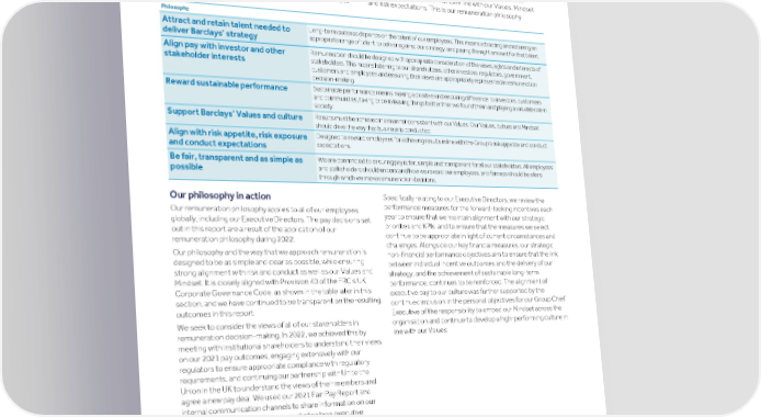 Strategic Shareholder Climate and Risk Financial Financial Barclays PLC 204 report information sustainability report Governance review review statements Annual Report 2022 Remuneration report (continued) Remuneration philosophy To attract and retain the people who can best deliver for our practices are transparently communicated and enable us to customers and clients, we must pay fairly and appropriately – reward sustainable performance in line with our Values, Mindset balancing the interests of all our stakeholders. Our policies and and risk expectations. This is our remuneration philosophy. Philosophy Long-term success depends on the talent of our employees. This means attracting and retaining an Attract and retain talent needed to appropriate range of talent to deliver against our strategy, and paying the right amount for that talent. deliver Barclays’ strategy Remuneration should be designed with appropriate consideration of the views, rights and interests of Align pay with investor and other stakeholders. This means listening to our shareholders, other investors, regulators, government, stakeholder interests customers and employees and ensuring their views are appropriately represented in remuneration decision-making. Sustainable performance means making a positive and enduring difference to investors, customers Reward sustainable performance and communities, taking pride in leaving things better than we found them and playing a valuable role in society. Results must be achieved in a manner consistent with our Values. Our Values, culture and Mindset Support Barclays’ Values and culture should drive the way that business is conducted. Designed to reward employees for achieving results in line with the Group’s risk appetite and conduct Align with risk appetite, risk exposure expectations. and conduct expectations We are committed to ensuring pay is fair, simple and transparent for all our stakeholders. All employees Be fair, transparent and as simple as and stakeholders should understand how we reward our employees, and fairness should be a lens possible through which we make remuneration decisions. Specifically relating to our Executive Directors, we review the Our philosophy in action performance measures for the forward-looking incentives each Our remuneration philosophy applies to all of our employees year to ensure that we maintain alignment with our strategic globally, including our Executive Directors. The pay decisions set priorities and KPIs, and to ensure that the measures we select out in this report are a result of the application of our continue to be appropriate in light of current circumstances and remuneration philosophy during 2022. challenges. Alongside our key financial measures, our strategic Our philosophy and the way that we approach remuneration is non-financial performance objectives aim to ensure that the link designed to be as simple and clear as possible, while ensuring between individual incentive outcomes and the delivery of our strong alignment with risk and conduct as well as our Values and strategy, and the achievement of sustainable long-term Mindset. It is closely aligned with Provision 40 of the FRC’s UK performance, continues to be reinforced. The alignment of Corporate Governance Code, as shown in the table later in this executive pay to our culture was further supported by the section, and we have continued to be transparent on the resulting continued inclusion in the personal objectives for our Group Chief outcomes in this report. Executive of the responsibility to embed our Mindset across the We seek to consider the views of all of our stakeholders in organisation and continue to develop a high-performing culture in remuneration decision-making. In 2022, we achieved this by line with our Values. meeting with institutional shareholders to understand their views on our 2021 pay outcomes, engaging extensively with our regulators to ensure appropriate compliance with regulatory requirements, and continuing our partnership with Unite the Union in the UK to understand the views of their members and agree a new pay deal. We used our 2021 Fair Pay Report and internal communication channels to share information on our approach to pay with colleagues, including how executive remuneration aligns with the wider workforce pay policy, and we are now publishing our fifth Fair Pay Report to help do the same for 2022.