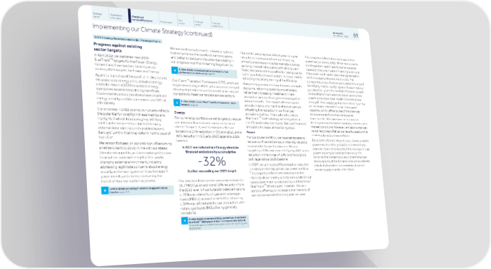 Strategic Shareholder Climate and Risk Financial Financial Barclays PLC 89 report information sustainability report Governance review review statements Annual Report 2022 Implementing our Climate Strategy (continued) TCFD Strategy Recommendation (b) | Strategic Pillar 2 We are continuing to invest in developing tools Our continued progress reflects year-on-year Our progress reflects the challenges in the Progress against existing that will enhance the quality of our forecasting reductions in emissions from our financing, power sector during 2022. While many clients sector targets and better understand the potential volatility in primarily a decrease in capital markets volumes continued to invest in additional renewables In April 2022, we published new 2030 our progress over the remaining target period. as rising interest rates paired with strong cash capacity, they also needed financing to ensure TM BlueTrack targets for the Power, Energy, flows tempered client appetite for raising capital. they could continue to meet energy demands Cement and Steel sectors, building on our Further details on management and oversight of our Lending activity showed a slight increase, mainly while managing elevated input costs. For + performance can be found on page 95. existing 2025 targets for Power and Energy. reflecting the strengthening of the US dollar. companies across Europe particularly, this meant Against a backdrop of the conflict in Ukraine and identifying how to rapidly replace Russian natural Our Client Transition Framework (CTF), which we Many energy producers have focused on capital the associated energy crisis, elevated energy gas supplies, given the conflict in Ukraine, as well began developing in 2022, will also provide insight discipline, returning capital to shareholders, prices for much of 2022 resulted in energy as shortfalls in hydroelectric power and nuclear into key dependencies and levers that will impact rather than increasing investment in new companies experiencing strong cash flows. power generation that resulted from heat and our ability to meet our targets across sectors. production and continuing to deleverage their Governments and corporations have prioritised drought. This supply gap has been filled in part by balance sheets. The impact of these capital energy security and (for consumers and SMEs) Further details on our Client Transition Framework can be an increased reliance on coal-fired power allocation decisions had the effect of partially + found on page 96. affordability. capacity, which offset some of the intensity offsetting the reduction in our financed improvements from their renewables Our progress in 2022 against our targets reflects emissions metrics. This is a function of our Energy TM investments. We have seen an increase in the potential for volatility in these metrics and BlueTrack methodology, whereby when a For our energy portfolio we set targets to reduce lending and capital markets activity, reflecting the highlights that our future progress will likely client's book value decreases, Barclays' financed our absolute financed emissions inclusive of market conditions. However, emissions intensity continue to be non-linear due to the many emissions increase, all else being equal. clients' Scope 1, 2, and 3 emissions. We are remained broadly flat, as we have focused on the external dependencies and variables beyond Power targeting a 15% reduction in CO e by 2025 and a 2 relative intensity of our portfolio. Barclays' control that may determine the pace of 40% reduction in CO e by 2030 against a 2020 For our power portfolio, we have set targets to 2 transition. Despite this forced return to coal, clients and the baseline. reduce our financed emission intensity resulting governments in the jurisdictions in which they We remain focused on our ambition of becoming from clients’ Scope 1 emissions. We are In 2022 we reduced our Energy absolute operate, have reiterated that this increase in coal a net zero bank by 2050, in line with our stated targeting a 30% reduction in CO e by 2025 and a 2 financed emissions by a cumulative power capacity will only be temporary. On Climate risk appetite, and acknowledge the need reduction in the range of 50% to 69% by 2030, balance, the consensus view is that the longer- to adapt our approach in light of the rapidly both against our 2020 baseline. term impacts of the Ukraine crisis will accelerate changing external environment, including -32% In 2022, we achieved a 9% cumulative reduction efforts to transition to renewables to avoid addressing legitimate concerns about energy in emission intensity across our power portfolio. similar supply shocks in the future. security and ensuring we continue to support further exceeding our 2025 target This progress reflects net reductions in the governments and clients in delivering the intensity of our lending activity and updated input transition to a low-carbon economy. Our absolute financed emissions were down to values used in our calculations (as outlined in our 51.7 MtCO e, an additional 10% reduction from TM 2 Further details on Barclays' Climate risk appetite can be BlueTrack Whitepaper), however, this was + the 2021 level. Of our total attributed emissions, found on page 283. partially offset by an increase in the intensity of c. 70% was related to oil, gas and natural gas our capital markets financing year-on-year. liquids (NGLs) production while the remaining c.30% was attributable to coal production, with natural gas liquids (NGLs) being generally immaterial. Further details on our use of NGLs can be found in our latest TM + BlueTrack Whitepaper in the ESG Resource Hub online at: home.barclays/sustainability/esg-resource-hub/reporting-and- disclosures/