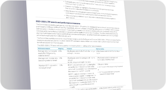 Strategic Shareholder Climate and Risk Financial Financial Barclays PLC 234 report information sustainability report Governance review review statements Annual Report 2022 Remuneration report (continued) Performance measure Metrics Personal (continued) Anna Cross: • Support the Business to grow sustainably, in line with the Group’s strategy, with specific focus on climate, capital and costs • Continue to optimise financial management reporting (particularly through technology) to drive benefits across the Group and to ensure a smooth transition to new rules and regulations • Continue to progress the transformation of the Treasury function, including strategic treasury and liquidity platforms • Oversee the effective management of the risk and controls agenda across Group Finance, and transform for the future where necessary • Retain focus on the colleague agenda across Group Finance – driving employee engagement, continuing to improve diversity, developing senior talent and succession planning • Effectively manage relationships with key external stakeholders including regulators and investors 2023-2025 LTIP awards and performance measures The Committee decided to grant awards under the 2023-2025 LTIP cycle to C.S. Venkatakrishnan and Anna Cross with face values at grant equal to 140% and 134% of Fixed Pay respectively, which will be based on Fixed Pay before applying the 1 March 2023 increases outlined earlier in this Remuneration report. Those maximum award multiples were determined following a detailed review of their individual performance throughout 2022 and recognising their significant personal contributions. This share-based award ensures alignment with future performance over the three-year assessment period, as well as shareholder alignment over the long release period (up to eight years from initial date of grant). The Committee carefully considered the performance measures for the Executive Directors' 2023-2025 LTIP and concluded that the measures adopted last year for the 2022-2024 LTIP continue to represent the most relevant building blocks toward our key longer- term financial and non-financial goals. The 2023-2025 LTIP award will be subject to the following forward-looking performance measures. Performance measure Weighting Threshold Maximum vesting Average return on tangible 25% 0% of award vests for RoTE of 8.0%, rising on 25% of award vests for RoTE of 12.5% or equity (RoTE) (excluding a straight-line basis higher a material items) Average cost: income ratio 10% 0% of award vests for average cost: income 10% of award vests for average cost: (excluding material items) ratio of income ratio of 58.0% or lower 62.5%, rising on a straight-line basis Maintain CET1 ratio within 10% If CET1 is below the target range during the 10% vests if either: b the target range period, the Committee will consider what • CET1 is within the range during the period portion of this element should vest, based on or the reasons for the CET1 shortfall • CET1 is above but making progress If CET1 is above the range and does not towards the target range make progress towards the range over the period, the Committee will consider what portion of the element should vest, based on the reasons for the elevated levels of CET1 versus target range and the associated impacts Relative Total Shareholder 25% 6.25% vests for performance at the median 25% of award vests for performance at or c d d Return (TSR) of the peer group , rising on a straight-line above the peer group upper quartile basis