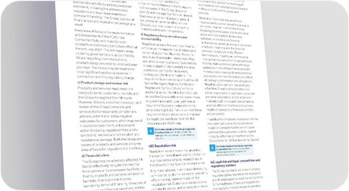 Strategic Shareholder Climate and Risk Financial Financial Barclays PLC 280 report information sustainability report Governance review review statements Annual Report 2022 Material existing and emerging risks (continued) financial services and understand the Group operates. Understanding the carbon intensity or local environmental protection available to them if something Conflicts of Interest that impact or impact; (ii) potential association with goes wrong. Poor customer outcomes can potentially impact the Group enables human rights violations (including result from the failure to: (i) communicate them to be handled appropriately. Even if combating modern slavery) in the Group’s fairly and clearly with customers; (ii) there is no evidence of improper actions, a operations or supply chain and by clients provide services in a timely and fair Conflict of Interest can create an and customers; and (iii) the financing of manner; (iii) handle and protect customer appearance of impropriety that businesses which manufacture and export data appropriately; and (iv) undertake undermines confidence in the Group and military and riot control goods and appropriate activity to address customer its Employees. If the Group does not services. detriment, including the adherence to identify and manage Conflicts of Interest Reputation risk could also arise from regulatory and legal requirements on (business or personal) appropriately, it negative public opinion about the actual, or complaint handling. The Group is at risk of could have an adverse effect on the perceived, manner in which the Group financial loss and reputational damage as a Group’s business, customers and the (including its employees, clients and other result. markets within which it operates. associations) conducts its business A key area of focus is the implementation f) Regulatory focus on culture and activities, or the Group’s financial accountability and embedment of the FCA’s new performance, as well as actual or perceived Consumer Duty, with rules for open practices in banking and the financial Regulators around the world continue to products and services due to take effect at services industry generally. Modern emphasise the importance of culture and the end July 2023. This will impact areas technologies, in particular, online social personal accountability and enforce the including governance and accountability, media channels and other broadcast tools adoption of adequate internal reporting MI and reporting, communications, that facilitate communication with large and whistleblowing procedures to help to product design and end-to-end customer audiences in short time frames and with promote appropriate conduct and drive journeys. The Group may be required to minimal costs, may significantly enhance positive outcomes for customers, incur significant additional expense in and accelerate the distribution and effect colleagues, clients and markets. The connection with this regulatory change. of damaging information and allegations. requirements and expectations of the UK Negative public opinion may adversely Senior Managers Regime, Certification c) Product design and review risk affect the Group’s ability to retain and Regime and Conduct Rules reinforce Products and services must meet the attract customers, in particular, corporate additional accountabilities for individuals needs of clients, customers, markets and and retail depositors, and to retain and across the Group, with an increased focus the Group throughout their life cycle, motivate staff, and could have a material on governance and rigour, with similar However, there is a risk that the design and adverse effect on the Group’s business, requirements also introduced in other review of the Group’s products and results of operations, financial condition jurisdictions globally. Failure to meet these services fail to reasonably consider and and prospects. requirements and expectations may lead address potential or actual negative to regulatory sanctions, both for the In addition to the above, reputation risk has outcomes for customers, which may result individuals and the Group. the potential to arise from operational in customer detriment, enforcement issues or conduct matters which cause For further details on the Group’s approach action (including regulatory fines and/or + to conduct risk, refer to the conduct risk detriment to customers, clients, market sanctions), redress and remediation and management and conduct risk performance integrity, effective competition or the sections. reputational damage. Both the design and Group (refer to ‘v) Operational risk’ above). review of products and services are a key viii) Reputation risk area of focus for regulators and the Group. For further details on the Group’s approach + to reputation risk, refer to the reputation Reputation risk is the risk that an action, d) Financial crime risk management and reputation risk transaction, investment, event, decision or performance sections. The Group may be adversely affected if it business relationship will reduce trust in fails to effectively mitigate the risk that ix) Legal risk and legal, competition and the Group’s integrity and/or competence. third parties or its employees facilitate, or regulatory matters Any material lapse in standards of integrity, that its products and services are used to The Group conducts activities in a highly compliance, customer service or operating facilitate, financial crime (money regulated global market which exposes it efficiency may represent a potential laundering, terrorist financing, breaches of and its employees to legal risk arising from: reputation risk. Stakeholder expectations economic and financial sanctions, bribery (i) the multitude of laws and regulations constantly evolve, and so reputation risk is and corruption, and the facilitation of tax that apply to the businesses it operates, dynamic and varies between geographica