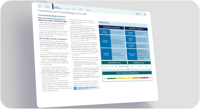 Strategic Shareholder Climate and Risk Financial Financial Barclays PLC 96 report information sustainability report Governance review review statements Annual Report 2022 Implementing our Climate Strategy (continued) TCFD Strategy Recommendation (b) | Strategic Pillar 2 The assessments under the two elements are Short and medium-term actions to combined to arrive at an overall CTF score from deliver on emission reduction targets T1 (best) to T5 (worst). In 2020, we started to measure and assess our The development of the CTF has been a cross- clients' emissions by building our financed TM bank exercise utilising the breadth of climate emissions methodology (BlueTrack ) and expertise across Barclays. It has been informed by setting interim emission reduction targets, a review of third-party frameworks (e.g. TPI, To achieve these targets, we will need to support CA100+, SBTi) and other industry initiatives (e.g. our clients to reduce the emissions that result UK's Transition Plan Taskforce, GFANZ). Design from their activities and those generated in their choices regarding material criteria have also been respective value chains. informed by internal sector analysis and insights New tool: Client Transition Framework (CTF) from our stress testing exercises. In our Climate Strategy, Targets and Progress Today, the CTF is primarily a benchmarking tool. document published in March 2022 we noted our Our initial assessments have been conducted for intention to develop a Client Transition Framework the majority of our corporate clients in sectors TM (CTF). This has been underway during 2022 and the where BlueTrack targets have previously been CTF will become a key tool in implementing our set: Power, Energy, Cement and Steel - over 150 TM climate strategy. clients in total. As new BlueTrack targets are set, The CTF will support our evaluation of our corporate the CTF will be applied to corporate clients in clients' current and expected future progress as those sectors. they transition to a low-carbon business model. Findings from those initial assessments include: The CTF includes quantitative and qualitative • c.80% of assessed clients have climate targets elements. The quantitative element assesses a • c.60% of clients assessed have executive client's alignment with our emissions targets and compensation tied to achievement of their sector benchmarks. climate goals. The qualitative element seeks to assess the The review process has also revealed a number of credibility of a client’s transition plan. It considers challenges in gaining an accurate assessment of criteria that serve as indicators of intent and clients' transition preparedness, in particular the ambition, and therefore the likelihood that a client availability and consistency of data. We will will meet its targets. For example, the low-carbon continue to work to address data quality technologies employed, and green capital or challenges we have identified in the next iteration operational expenditure plans. of the CTF. Most of these criteria are consistent across The CTF has also provided insight into key sectors, however we also consider some sector- dependencies and levers that will impact our specific criteria. This includes Energy sector ability to meet our targets across sectors. clients' commitments on methane emissions Further details on the dependencies impacting our reduction and Power sector clients' commitments + strategy can be found on page 135. to phase-out thermal coal.