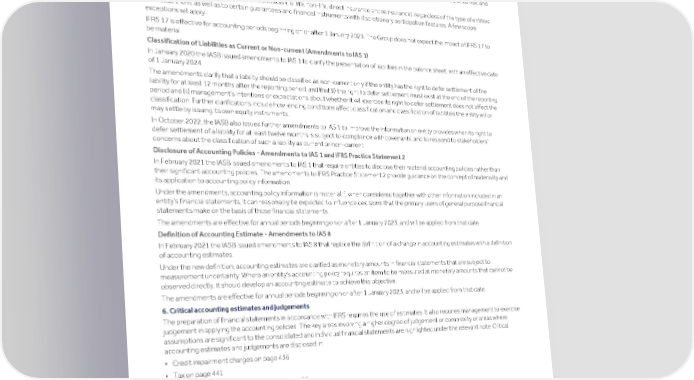 Strategic Shareholder Climate and Risk Financial Financial Barclays PLC 427 report information sustainability report Governance review review statements Annual Report 2022 Notes to the financial statements (continued) For the year ended 31 December 2022 IFRS 17 – Insurance contracts In May 2017, the IASB issued IFRS 17 Insurance Contracts, a comprehensive new accounting standard for insurance contracts covering recognition and measurement, presentation and disclosure. IFRS 17 will replace IFRS 4 Insurance Contracts that was issued in 2005. In June 2020, the IASB published amendments to IFRS 17, to include scope exclusion for certain credit card contracts and similar contracts that provide insurance coverage, the optional scope exclusion for loan contracts that transfer significant insurance risk, and the clarification that only financial guarantees issued are in scope of IFRS 9. IFRS 17 applies to all types of insurance contracts (i.e. life, non-life, direct insurance and reinsurance), regardless of the type of entities that issue them, as well as to certain guarantees and financial instruments with discretionary participation features. A few scope exceptions will apply. IFRS 17 is effective for accounting periods beginning on or after 1 January 2023. The Group does not expect the impact of IFRS 17 to be material. Classification of Liabilities as Current or Non-current (Amendments to IAS 1) In January 2020 the IASB issued amendments to IAS 1 to clarify the presentation of liabilities in the balance sheet, with an effective date of 1 January 2024. The amendments clarify that a liability should be classified as non-current only if the entity has the right to defer settlement of the liability for at least 12 months after the reporting period, and that (i) the right to defer settlement must exist at the end of the reporting period and (ii) management’s intentions or expectations about whether it will exercise its right to defer settlement does not affect the classification. Further clarifications include how lending conditions affect classification and classification of liabilities the entity will or may settle by issuing its own equity instruments. In October 2022, the IASB also issued further amendments to IAS 1 to improve the information an entity provides when its right to defer settlement of a liability for at least twelve months is subject to compliance with covenants, and to respond to stakeholders’ concerns about the classification of such a liability as current or non-current. Disclosure of Accounting Policies - Amendments to IAS 1 and IFRS Practice Statement 2 In February 2021 the IASB issued amendments to IAS 1 that require entities to disclose their material accounting policies rather than their significant accounting policies. The amendments to IFRS Practice Statement 2 provide guidance on the concept of materiality and its application to accounting policy information. Under the amendments, accounting policy information is material if, when considered together with other information included in an entity’s financial statements, it can reasonably be expected to influence decisions that the primary users of general purpose financial statements make on the basis of those financial statements. The amendments are effective for annual periods beginning on or after 1 January 2023, and will be applied from that date. Definition of Accounting Estimate - Amendments to IAS 8 In February 2021 the IASB issued amendments to IAS 8 that replace the definition of a change in accounting estimates with a definition of accounting estimates. Under the new definition, accounting estimates are clarified as monetary amounts in financial statements that are subject to measurement uncertainty. Where an entity's accounting policy requires an item to be measured at monetary amounts that cannot be observed directly, it should develop an accounting estimate to achieve this objective. The amendments are effective for annual periods beginning on or after 1 January 2023, and will be applied from that date. 6. Critical accounting estimates and judgements The preparation of financial statements in accordance with IFRS requires the use of estimates. It also requires management to exercise judgement in applying the accounting policies. The key areas involving a higher degree of judgement or complexity or areas where assumptions are significant to the consolidated and individual financial statements are highlighted under the relevant note. Critical accounting estimates and judgements are disclosed in: ▪ Credit impairment charges on page 436 ▪ Tax on page 441 ▪ Fair value of financial instruments on page 456 ▪ Goodwill and intangible assets on page 475 ▪ Pensions and post-retirement benefit obligations on page 496 ▪ Provisions including conduct and legal, competition and regulatory matters on page 477. 7. Other disclosures To improve transparency and ease of reference, by concentrating related information in one place, certain disclosures required under IFRS have been included within the Risk review section as follows: ▪ Credit risk on pages 289 to 291 and 300 to 340 ▪ Market risk on page 291 and 341 to 342 ▪ Treasury and Capital risk – liquidity on page 292 and 344 to 354 ▪ Treasury and Capital risk – capital on page 292 and 355 to 362. These disclosures are covered by the Audit opinion (included on pages 399 to 415) where referenced as audited.