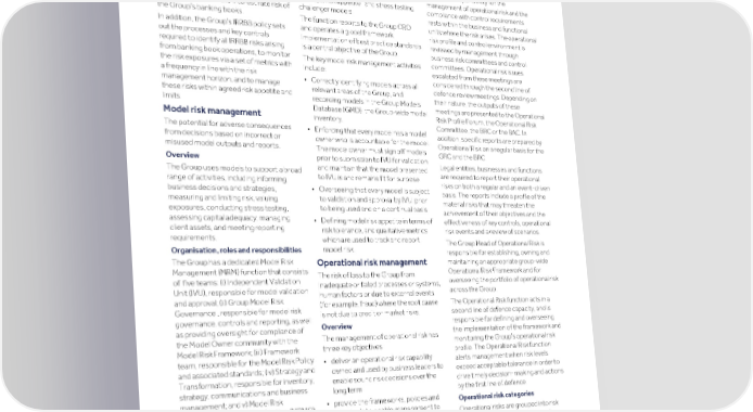 Strategic Shareholder Climate and Risk Financial Financial Barclays PLC 293 report information sustainability report Governance review review statements Annual Report 2022 Principal risk management (continued) Treasury and Capital Risk Committee development, monitoring, annual review, be transacted and risk taken without monitors and reviews the IRRBB risk profile independent validation and approval, exposing it to unacceptable potential losses or reputational damages. and control environment, providing change and reporting processes. The second line oversight of the management policy is supported by global standards Organisation, roles and responsibilities of IRRBB. The BRC reviews the interest covering model inventory, documentation, The prime responsibility for the rate risk profile, including review of the risk validation, testing and monitoring, management of operational risk and the appetite at least annually and the impact of overlays, risk appetite, and stress testing compliance with control requirements stress scenarios on the interest rate risk of challenger models. rests within the business and functional the Group’s banking books. The function reports to the Group CRO units where the risk arises. The operational In addition, the Group’s IRRBB policy sets and operates a global framework. risk profile and control environment is out the processes and key controls Implementation of best practice standards reviewed by management through required to identify all IRRBB risks arising is a central objective of the Group. business risk committees and control from banking book operations, to monitor committees. Operational risk issues The key model risk management activities the risk exposures via a set of metrics with escalated from these meetings are include: a frequency in line with the risk considered through the second line of • Correctly identifying models across all management horizon, and to manage defence review meetings. Depending on relevant areas of the Group, and these risks within agreed risk appetite and their nature, the outputs of these recording models in the Group Models limits. meetings are presented to the Operational Database (GMD), the Group-wide model Risk Profile Forum, the Operational Risk Model risk management inventory. Committee, the BRC or the BAC. In The potential for adverse consequences • Enforcing that every model has a model addition, specific reports are prepared by from decisions based on incorrect or owner who is accountable for the model. Operational Risk on a regular basis for the misused model outputs and reports. The model owner must sign off models GRC and the BRC. prior to submission to IVU for validation Overview Legal entities, businesses and functions and maintain that the model presented The Group uses models to support a broad are required to report their operational to IVU is and remains fit for purpose. range of activities, including informing risks on both a regular and an event-driven • Overseeing that every model is subject business decisions and strategies, basis. The reports include a profile of the to validation and approval by IVU, prior measuring and limiting risk, valuing material risks that may threaten the to being used and on a continual basis. exposures, conducting stress testing, achievement of their objectives and the assessing capital adequacy, managing • Defining model risk appetite in terms of effectiveness of key controls, operational client assets, and meeting reporting risk tolerance, and qualitative metrics risk events and a review of scenarios. requirements. which are used to track and report The Group Head of Operational Risk is model risk. Organisation, roles and responsibilities responsible for establishing, owning and The Group has a dedicated Model Risk maintaining an appropriate group-wide Operational risk management Management (MRM) function that consists Operational Risk Framework and for The risk of loss to the Group from of five teams: (i) Independent Validation overseeing the portfolio of operational risk inadequate or failed processes or systems, Unit (IVU), responsible for model validation across the Group. human factors or due to external events and approval; (ii) Group Model Risk The Operational Risk function acts in a (for example, fraud) where the root cause Governance , responsible for model risk second line of defence capacity, and is is not due to credit or market risks. governance, controls and reporting, as well responsible for defining and overseeing Overview as providing oversight for compliance of the implementation of the framework and The management of operational risk has the Model Owner community with the monitoring the Group’s operational risk three key objectives: Model Risk Framework; (iii) Framework profile. The Operational Risk function team, responsible for the Model Risk Policy • deliver an operational risk capability alerts management when risk levels and associated standards; (iv) Strategy and owned and used by business leaders to exceed acceptable tolerance in order to Transformation, responsible for inventory, enable sound risk decisions over the drive timely decision- making and actions strategy, communications and business long term by the first line of defence. management; and v) Model Risk • provide the frameworks, policies and Operational risk categories Measurement and Quantification (MRMQ), standards to enable management to Operational risks are grouped into risk responsible for the design of the meet their risk management categories to support effective risk framework and methodology to measure responsibilities while the second line of management, measurement and and, where possible, quantify model risk. It defence provides robust, independent, reporting. These comprise: Data is also responsible for the strategic and effective oversight and challenge Management Risk; Financial Reporting Validation Centre of Excellence (VCoE), • deliver a consisten
