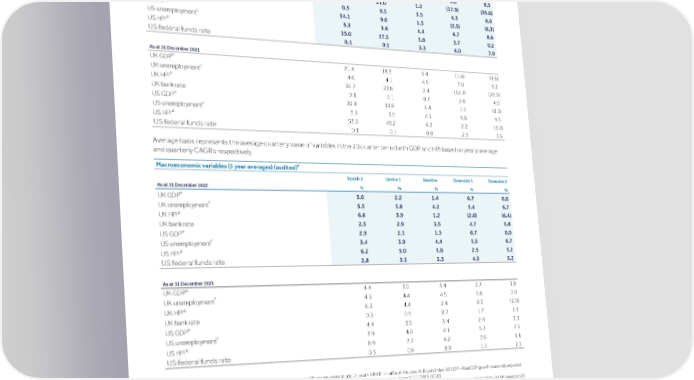 Strategic Shareholder Climate and Risk Financial Financial Barclays PLC 321 report information sustainability report Governance review review statements Annual Report 2022 Risk performance - Credit risk (continued) a Macroeconomic variables (specific bases) (audited) Upside 2 Upside 1 Baseline Downside 1 Downside 2 As at 31 December 2022 % % % % % b UK GDP 13.9 9.4 1.4 (3.2) (6.8) c UK unemployment 3.4 3.6 4.2 6.6 8.5 d UK HPI 37.8 21.0 1.2 (17.9) (35.0) UK bank rate 0.5 0.5 3.5 6.3 8.0 b US GDP 14.1 9.6 1.3 (2.5) (6.3) c US unemployment 3.3 3.6 4.4 6.7 8.6 d US HPI 35.0 27.5 3.8 3.7 0.2 US federal funds rate 0.1 0.1 3.3 6.0 7.0 As at 31 December 2021 b UK GDP 21.4 18.3 3.4 (1.6) (1.6) c UK unemployment 4.0 4.1 4.5 7.0 9.2 d UK HPI 35.7 23.8 2.4 (12.7) (29.9) UK bank rate 0.1 0.1 0.7 2.8 4.0 b US GDP 22.8 19.6 3.4 1.5 (1.3) c US unemployment 3.3 3.5 4.1 6.8 9.5 d US HPI 53.3 45.2 6.2 2.2 (5.0) US federal funds rate 0.1 0.1 0.8 2.3 3.5 Average basis represents the average quarterly value of variables in the 20 quarter period with GDP and HPI based on yearly average and quarterly CAGRs respectively. a Macroeconomic variables (5 year averages) (audited) Upside 2 Upside 1 Baseline Downside 1 Downside 2 As at 31 December 2022 % % % % % e UK GDP 3.0 2.2 1.4 0.7 0.0 f UK unemployment 3.5 3.8 4.2 5.4 6.7 g UK HPI 6.6 3.9 1.2 (2.6) (6.4) UK bank rate 2.5 2.9 3.5 4.7 5.8 e US GDP 2.9 2.1 1.3 0.7 0.0 f US unemployment 3.4 3.9 4.4 5.5 6.7 g US HPI 6.2 5.0 3.8 2.5 1.2 US federal funds rate 2.8 3.1 3.3 4.3 5.2 As at 31 December 2021 e UK GDP 4.4 3.9 3.4 2.7 1.8 f UK unemployment 4.3 4.4 4.5 5.8 7.0 g UK HPI 6.3 4.4 2.4 0.3 (2.0) UK bank rate 0.3 0.5 0.7 1.7 2.3 e US GDP 4.4 3.9 3.4 2.4 1.3 f US unemployment 3.9 4.0 4.1 5.7 7.1 g US HPI 8.9 7.7 6.2 3.6 1.4 US federal funds rate 0.5 0.6 0.8 1.5 2.1 Notes a UK GDP = Real GDP growth seasonally adjusted; UK unemployment = UK unemployment rate 16-year+; UK HPI = Halifax All Houses, All Buyers Index; US GDP = Real GDP growth seasonally adjusted; US unemployment = US civilian unemployment rate 16-year+; US HPI = FHFA house price index. 20 quarter period starts from Q121 (2020: Q120). b Maximum growth relative to Q420 (2021: Q419), based on 20 quarter period in Upside scenarios; 5-year yearly average CAGR in Baseline; minimum growth relative to Q420 (2021: Q419), based on 20 quarter period in Downside scenarios. c Lowest quarter in Upside scenarios; 5-year average in Baseline; highest quarter in Downside scenarios. Period based on 20 quarters from Q121 (2021: Q120). d Maximum growth relative to Q420 (2021: Q419), based on 20 quarter period in Upside scenarios; 5-year quarter end CAGR in Baseline; minimum growth relative to Q420 (2021: Q419), based on 20 quarter period in Downside scenarios. e 5-year yearly average CAGR, starting 2021 (2021: 2020). f 5-year average, Period based on 20 quarters from Q121 (2021: Q120). g 5-year quarter end CAGR, starting Q420 (2021: Q419).