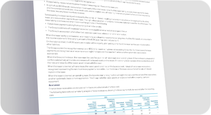 Strategic Shareholder Climate and Risk Financial Financial Barclays PLC 471 report information sustainability report Governance review review statements Annual Report 2022 Notes to the financial statements (continued) Assets at amortised cost and other investments 21 Leases Accounting for leases IFRS 16 applies to all leases with the exception of licences of intellectual property, rights held by licensing agreements within the scope of IAS 38 Intangible Assets, service concession arrangements, leases of biological assets within the scope of IAS 41 Agriculture and leases of minerals, oil, natural gas and similar non-regenerative resources. IFRS 16 includes an accounting policy choice for a lessee to elect not to apply IFRS 16 to remaining assets within the scope of IAS 38 Intangible Assets which the Group has decided to apply. When the Group is the lessee, it is required to recognise both: ▪ A lease liability, measured at the present value of remaining cash flows on the lease, and ▪ A right of use (ROU) asset, measured at the amount of the initial measurement of the lease liability, plus any lease payments made prior to commencement date, initial direct costs, and estimated costs of restoring the underlying asset to the condition required by the lease, less any lease incentives received. Subsequently the lease liability will increase for the accrual of interest, resulting in a constant rate of return throughout the life of the lease, and reduce when payments are made. The right of use asset will amortise to the income statement over the life of the lease. The lease liability is remeasured when there is a change in one of the following: ▪ Future lease payments arising from a change in an index or rate; ▪ The Group’s estimate of the amount expected to be payable under a residual value guarantee; or ▪ The Group’s assessment of whether it will exercise a purchase, extension or termination option. When the lease liability is remeasured, a corresponding adjustment is made to the carrying amount of the ROU asset, or is recorded in the income statement if the carrying amount of the ROU asset has been reduced to nil. On the balance sheet, the ROU assets are included within property, plant and equipment and the lease liabilities are included within other liabilities. The Group applies the recognition exemption in IFRS 16 for leases with a term not exceeding 12 months. For these leases the lease payments are recognised as an expense on a straight line basis over the lease term unless another systematic basis is more appropriate. When the Group is the lessor, the lease must be classified as either a finance lease or an operating lease. A finance lease is a lease which confers substantially all the risks and rewards of the leased assets on the lessee. An operating lease is a lease where substantially all of the risks and rewards of the leased asset remain with the lessor. When the lease is deemed a finance lease, the leased asset is not held on the balance sheet; instead a finance lease receivable is recognised representing the minimum lease payments receivable under the terms of the lease, discounted at the rate of interest implicit in the lease. When the lease is deemed an operating lease, the lease income is recognised on a straight-line basis over the period of the lease unless another systematic basis is more appropriate. The Group holds the leased assets on balance sheet within property, plant and equipment. As a Lessor Finance lease receivables are included within loans and advances at amortised cost. The following table sets out a maturity analysis of lease receivables, showing the lease payments to be received after the reporting date. 2022 2021 Present value Present value Gross of minimum Gross of minimum investment in lease Unguaranteed investment in lease Unguaranteed finance lease Future finance payments residual finance lease Future finance payments residual receivables income receivable values receivables income receivable values £m £m £m £m £m £m £m £m Not more than one year 14 (1) 13 — 29 (3) 26 — One to two years 9 (1) 8 — 19 (2) 17 — Two to three years 2 — 2 — 6 — 6 — Three to four years 1 — 1 — 2 — 2 — Four to five years 1 — 1 — 1 — 1 — Over five years 1 — 1 — 1 — 1 — Total 28 (2) 26 — 58 (5) 53 — Barclays Asset Finance provided leasing and other asset finance facilities across a broad range of asset types to business and individual customers.There is no impairment allowance for finance lease receivables in current and previous year. The Group does not have any material operating leases as a lessor.