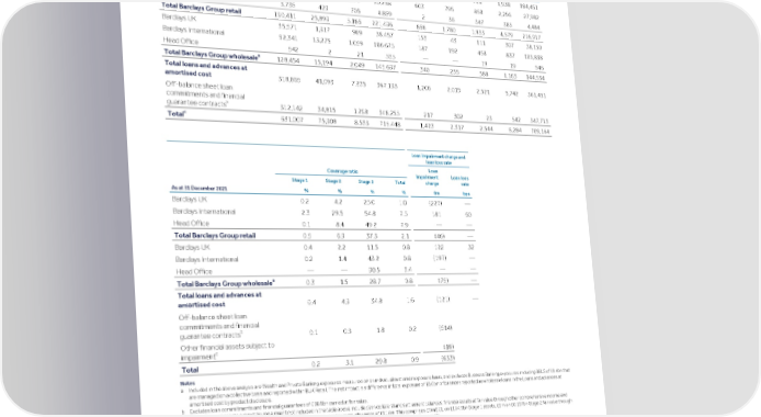 Strategic Shareholder Climate and Risk Financial Financial Barclays PLC 305 report information sustainability report Governance review review statements Annual Report 2022 Risk performance - Credit risk (continued) Loans and advances at amortised cost by stage (audited) Gross exposure Impairment allowance Stage 1 Stage 2 Stage 3 Total Stage 1 Stage 2 Stage 3 Total Net exposure As at 31 December 2021 £m £m £m £m £m £m £m £m £m Barclays UK 160,695 22,779 2,915 186,389 261 949 728 1,938 184,451 Barclays International 25,981 2,691 1,566 30,238 603 795 858 2,256 27,982 Head Office 3,735 429 705 4,869 2 36 347 385 4,484 Total Barclays Group retail 190,411 25,899 5,186 221,496 866 1,780 1,933 4,579 216,917 Barclays UK 35,571 1,917 969 38,457 153 43 111 307 38,150 Barclays International 92,341 13,275 1,059 106,675 187 192 458 837 105,838 Head Office 542 2 21 565 — — 19 19 546 a Total Barclays Group wholesale 128,454 15,194 2,049 145,697 340 235 588 1,163 144,534 Total loans and advances at amortised cost 318,865 41,093 7,235 367,193 1,206 2,015 2,521 5,742 361,451 Off-balance sheet loan commitments and financial b guarantee contracts 312,142 34,815 1,298 348,255 217 302 23 542 347,713 c Total 631,007 75,908 8,533 715,448 1,423 2,317 2,544 6,284 709,164 Loan impairment charge and loan loss rate Loan Coverage ratio impairment Loan loss Stage 1 Stage 2 Stage 3 Total charge rate As at 31 December 2021 % % % % £m bps Barclays UK 0.2 4.2 25.0 1.0 (227) — Barclays International 2.3 29.5 54.8 7.5 181 60 Head Office 0.1 8.4 49.2 7.9 — — Total Barclays Group retail 0.5 6.9 37.3 2.1 (46) — Barclays UK 0.4 2.2 11.5 0.8 122 32 Barclays International 0.2 1.4 43.2 0.8 (197) — Head Office — — 90.5 3.4 — — a Total Barclays Group wholesale 0.3 1.5 28.7 0.8 (75) — Total loans and advances at amortised cost 0.4 4.9 34.8 1.6 (121) — Off-balance sheet loan commitments and financial b guarantee contracts 0.1 0.9 1.8 0.2 (514) Other financial assets subject to c impairment (18) Total 0.2 3.1 29.8 0.9 (653) Notes a Included in the above analysis are Wealth and Private Banking exposures measured on an individual customer exposure basis, and excludes Business Banking exposures including BBLS of £9.4bn that are managed on a collective basis and reported within BUK Retail. The net impact is a difference in total exposure of £6.0bn of balances reported as wholesale loans in the Loans and advances at amortised cost by product disclosure. b Excludes loan commitments and financial guarantees of £18.8bn carried at fair value. c Other financial assets subject to impairment not included in the table above include cash collateral and settlement balances, financial assets at fair value through other comprehensive income and other assets. These have a total gross exposure of £155.2bn and impairment allowance of £114m. This comprises £6m ECL on £154.9bn Stage 1 assets, £1m on £0.157bn Stage 2 fair value through other comprehensive income assets, cash collateral and settlement balances and £107m on £110m Stage 3 other assets.