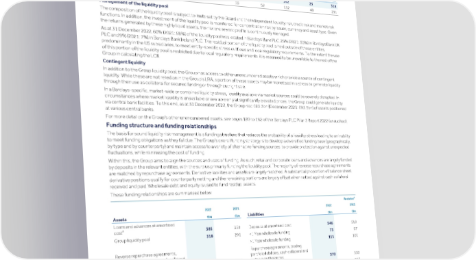 Strategic Shareholder Climate and Risk Financial Financial Barclays PLC 347 report information sustainability report Governance review review statements Annual Report 2022 Risk performance - Treasury and Capital risk (continued) The Group liquidity pool is well diversified by major currency and the Group monitors LRA stress scenarios for major currencies. Liquidity pool by currency USD EUR GBP Other Total £bn £bn £bn £bn £bn Liquidity pool as at 31 December 2022 72 79 142 25 318 Liquidity pool as at 31 December 2021 59 52 132 48 291 Management of the liquidity pool The composition of the liquidity pool is subject to limits set by the Board and the independent liquidity risk, credit risk and market risk functions. In addition, the investment of the liquidity pool is monitored for concentration risk by issuer, currency and asset type. Given the returns generated by these highly liquid assets, the risk and reward profile is continuously managed. As at 31 December 2022, 60% (2021: 58%) of the liquidity pool was located in Barclays Bank PLC, 25% (2021: 30%) in Barclays Bank UK PLC and 9% (2021: 7%) in Barclays Bank Ireland PLC. The residual portion of the liquidity pool is held outside of these entities, predominantly in the US subsidiaries, to meet entity-specific stress outflows and local regulatory requirements. To the extent the use of this portion of the liquidity pool is restricted due to local regulatory requirements, it is assumed to be unavailable to the rest of the Group in calculating the LCR. Contingent liquidity In addition to the Group liquidity pool, the Group has access to other unencumbered assets which provide a source of contingent liquidity. While these are not relied on in the Group’s LRA, a portion of these assets may be monetised in a stress to generate liquidity through their use as collateral for secured funding or through outright sale. In a Barclays-specific, market-wide or combined liquidity stress, liquidity available via market sources could be severely disrupted. In circumstances where market liquidity is unavailable or available only at significantly elevated prices, the Group could generate liquidity via central bank facilities. To this end, as at 31 December 2022, the Group had £83.3bn (December 2021: £93.3bn) of assets positioned at various central banks. For more detail on the Group’s other unencumbered assets, see pages 180 to 182 of the Barclays PLC Pillar 3 Report 2022 (unaudited). Funding structure and funding relationships The basis for sound liquidity risk management is a funding structure that reduces the probability of a liquidity stress leading to an inability to meet funding obligations as they fall due. The Group’s overall funding strategy is to develop a diversified funding base (geographically, by type and by counterparty) and maintain access to a variety of alternative funding sources, to provide protection against unexpected fluctuations, while minimising the cost of funding. Within this, the Group aims to align the sources and uses of funding. As such, retail and corporate loans and advances are largely funded by deposits in the relevant entities, with the surplus primarily funding the liquidity pool. The majority of reverse repurchase agreements are matched by repurchase agreements. Derivative liabilities and assets are largely matched. A substantial proportion of balance sheet derivative positions qualify for counterparty netting and the remaining portions are largely offset when netted against cash collateral received and paid. Wholesale debt and equity is used to fund residual assets. These funding relationships are summarised below: c Restated 2022 2021 2022 2021 Assets Liabilities £bn £bn £bn £bn Loans and advances at amortised a cost 385 358 Deposits at amortised cost 546 519 Group liquidity pool 318 291 1 Year wholesale funding 111 101 Reverse repurchase agreements, Repurchase agreements, trading trading portfolio assets, cash collateral portfolio liabilities, cash collateral and and settlement balances 412 388 settlement balances 370 330 Derivative financial instruments 302 263 Derivative financial instruments 290 257 b Other assets 97 84 Other liabilities 55 40 Equity 69 70 Total assets 1,514 1,384 Total liabilities 1,514 1,384 Notes a Adjusted for liquidity pool debt securities reported at amortised costs of £14bn (December 2021: £3bn). b Other assets include fair value assets that are not part of reverse repurchase agreements or trading portfolio assets, and other asset categories. c 2021 financial and capital metrics have been restated to reflect the impact of the Over-issuance of Securities. See Impact of the Over-issuance of Securities on page 356 and Restatement of financial statements (Note 1a) on page 428 for further details.