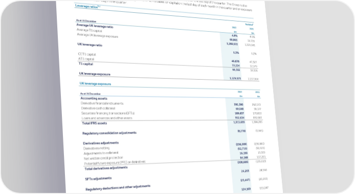 Strategic Shareholder Climate and Risk Financial Financial Barclays PLC 360 report information sustainability report Governance review review statements Annual Report 2022 Risk performance - Treasury and Capital risk (continued) Operational risk RWAs increased £2.1bn: • A £2.1bn increase in book size primarily driven by the inclusion of higher 2022 CIB income compared to 2019 Leverage ratios and exposures The Group is required to disclose a UK leverage ratio based on capital and exposure on the last day of the quarter. The Group is also required to disclose an average UK leverage ratio which is based on capital on the last day of each month in the quarter and an exposure measure for each day in the quarter. b,c Leverage ratios a Restated 2022 2021 As at 31 December £m £m Average UK leverage ratio 4.8 % 4.9 % Average T1 capital 60,865 59,739 Average UK leverage exposure 1,280,972 1,229,041 UK leverage ratio 5.3 % 5.2 % CET1 capital 46,878 47,327 AT1 capital 13,224 12,179 T1 capital 60,102 59,506 UK leverage exposure 1,129,973 1,137,904 UK leverage exposure 2022 2021 As at 31 December £m £m Accounting assets Derivative financial instruments 302,380 262,572 Derivative cash collateral 69,048 58,177 Securities financing transactions (SFTs) 189,637 170,853 Loans and advances and other assets 952,634 892,683 Total IFRS assets 1,513,699 1,384,285 Regulatory consolidation adjustments (8,278) (3,665) Derivatives adjustments Derivatives netting (256,309) (236,881) Adjustments to collateral (52,715) (50,929) Net written credit protection 16,190 15,509 Potential future exposure (PFE) on derivatives 84,168 137,291 Total derivatives adjustments (208,666) (135,010) SFTs adjustments 24,203 24,544 Regulatory deductions and other adjustments (21,447) (20,219) Weighted off-balance sheet commitments 124,169 115,047 Qualifying central bank claims (272,321) (210,134) Settlement netting (21,386) (16,944) UK leverage exposure 1,129,973 1,137,904 Notes a Capital and leverage metrics as at 31 December 2021 have been restated to reflect the impact of the Over-issuance of Securities. See Impact of Over-issuance of Securities on page 356 for further details. b Fully loaded average UK leverage ratio was 4.7%, with £60.1bn of T1 capital and £1,280.2bn of leverage exposure. Fully loaded UK leverage ratio was 5.3%, with £59.4bn of T1 capital and £1,129.3bn of leverage exposure. Fully loaded UK leverage ratios are calculated without applying the transitional arrangements of the CRR as amended by CRR II. c Capital and leverage measures are calculated applying the transitional arrangements of the CRR as amended by CRR II.