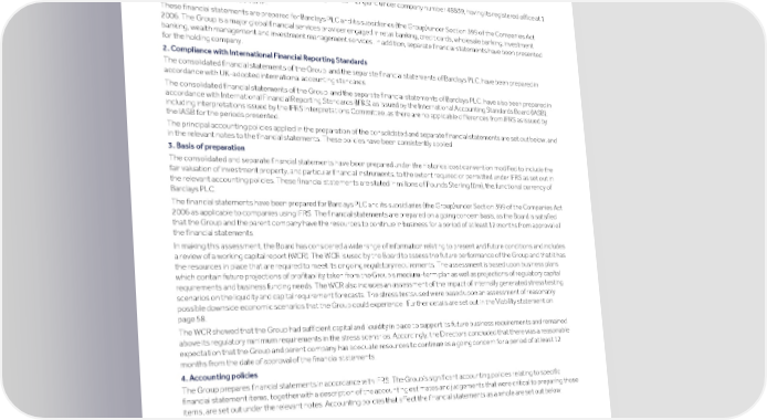 Strategic Shareholder Climate and Risk Financial Financial Barclays PLC 424 report information sustainability report Governance review review statements Annual Report 2022 Notes to the financial statements For the year ended 31 December 2022 This section describes the Group’s significant policies and critical accounting estimates that relate to the financial statements and notes as a whole. If an accounting policy or a critical accounting estimate relates to a particular note, the accounting policy and/or critical accounting estimate is contained with the relevant note. 1 Significant accounting policies 1. Reporting entity Barclays PLC is a public company limited by shares registered in England under company number 48839, having its registered office at 1 Churchill Place, London, E14 5HP. These financial statements are prepared for Barclays PLC and its subsidiaries (the Group) under Section 399 of the Companies Act 2006. The Group is a major global financial services provider engaged in retail banking, credit cards, wholesale banking, investment banking, wealth management and investment management services. In addition, separate financial statements have been presented for the holding company. 2. Compliance with International Financial Reporting Standards The consolidated financial statements of the Group, and the separate financial statements of Barclays PLC, have been prepared in accordance with UK-adopted international accounting standards. The consolidated financial statements of the Group, and the separate financial statements of Barclays PLC, have also been prepared in accordance with International Financial Reporting Standards (IFRS) as issued by the International Accounting Standards Board (IASB), including interpretations issued by the IFRS Interpretations Committee, as there are no applicable differences from IFRS as issued by the IASB for the periods presented. The principal accounting policies applied in the preparation of the consolidated and separate financial statements are set out below, and in the relevant notes to the financial statements. These policies have been consistently applied. 3. Basis of preparation The consolidated and separate financial statements have been prepared under the historical cost convention modified to include the fair valuation of investment property, and particular financial instruments, to the extent required or permitted under IFRS as set out in the relevant accounting policies. These financial statements are stated in millions of Pounds Sterling (£m), the functional currency of Barclays PLC. The financial statements have been prepared for Barclays PLC and its subsidiaries (the Group) under Section 399 of the Companies Act 2006 as applicable to companies using IFRS. The financial statements are prepared on a going concern basis, as the Board is satisfied that the Group and the parent company have the resources to continue in business for a period of at least 12 months from approval of the financial statements. In making this assessment, the Board has considered a wide range of information relating to present and future conditions and includes a review of a working capital report (WCR). The WCR is used by the Board to assess the future performance of the Group and that it has the resources in place that are required to meet its ongoing regulatory requirements. The assessment is based upon business plans which contain future projections of profitability taken from the Group’s medium-term plan as well as projections of regulatory capital requirements and business funding needs. The WCR also includes an assessment of the impact of internally generated stress testing scenarios on the liquidity and capital requirement forecasts. The stress tests used were based upon an assessment of reasonably possible downside economic scenarios that the Group could experience. Further details are set out in the Viability statement on page 58. The WCR showed that the Group had sufficient capital and liquidity in place to support its future business requirements and remained above its regulatory minimum requirements in the stress scenarios. Accordingly, the Directors concluded that there was a reasonable expectation that the Group and parent company has adequate resources to continue as a going concern for a period of at least 12 months from the date of approval of the financial statements. 4. Accounting policies The Group prepares financial statements in accordance with IFRS. The Group’s significant accounting policies relating to specific financial statement items, together with a description of the accounting estimates and judgements that were critical to preparing those items, are set out under the relevant notes. Accounting policies that affect the financial statements as a whole are set out below. (i) Consolidation The Group applies IFRS 10 Consolidated financial statements. The consolidated financial statements combine the financial statements of Barclays PLC and all its subsidiaries. Subsidiaries are entities over which Barclays PLC has control. The Group has control over another entity when the Group has all of the following: 1)power over the relevant activities of the investee, for example through voting or other rights 2)exposure to, or rights to, variable returns from its involvement with the investee, and 3)the ability to affect those returns through its power over the investee. The assessment of control is based on the consideration of all facts and circumstances. The Group reassesses whether it controls an investee if facts and circumstances indicate that there are changes to one or more of the three elements of control. Intra-group transactions and balances are eliminated on consolidation. Consistent accounting policies are used throughout the Group for the purposes of the consolidation. Changes in ownership interests in subsidiaries are accounted for as equity transactions if they occur after control has already been obtained and they do not