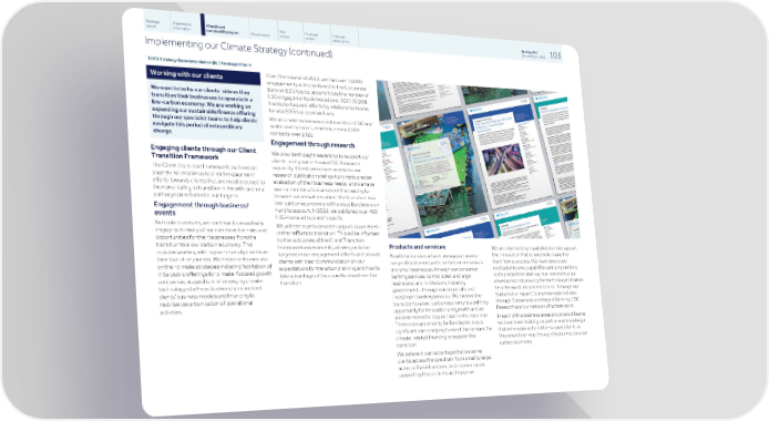 Strategic Shareholder Climate and Risk Financial Financial Barclays PLC 103 report information sustainability report Governance review review statements Annual Report 2022 Implementing our Climate Strategy (continued) TCFD Strategy Recommendation (b) | Strategic Pillar 3 Over the course of 2022, we had over 15,000 Working with our clients engagements with clients within the Corporate Bank on ESG topics, around triple the number of We want to be by our clients' side as they ESG engagements delivered over 2021 (5,000), transition their businesses to operate in a thanks to focused efforts by relationship teams low-carbon economy. We are working on to raise ESG topics proactively. expanding our sustainable finance offering We also held numerous client events on ESG and through our specialist teams to help clients sustainability topics, reaching nearly 2,000 navigate this period of extraordinary contacts over 2022. change. Engagement through research Engaging clients through our Client We provide thought leadership to support our Transition Framework clients, using our in-house ESG Research capability. Clients who have access to our The Client Transition Framework, outlined on research publications tell us it prompts greater page 96, will enable us to direct engagement evaluation of their business needs, and we have efforts towards clients that are most exposed to seen a number of instances of this leading to the risk of failing to transition in line with sectoral broader conversations about the transition to a pathways as reflected in our targets. low-carbon economy and the ways Barclays is on Engagement through business/ hand to support. In 2022, we published over 400 events ESG-focused research reports. As trusted advisers, we continue to proactively We will continue to provide support to our clients engage with many of our clients on the risks and in their efforts to transition. This will be informed opportunities for their businesses from the by the outcomes of the Client Transition transition to a low-carbon economy. This Products and services Framework assessments, allowing us to be We are also building capabilities to help support includes working with higher-intensity clients on targeted in our engagement efforts and provide the innovation that is needed to make the As a British universal bank, we support a wide their transition journey. We help clients execute clients with clear communication on our transition a success. We have developed range of customers and clients from individuals on their climate strategies including facilitation of expectations for transition planning and how to dedicated teams, capabilities and propositions and small businesses through our consumer initial public offerings for climate-focused growth take advantage of the opportunities from the to help scale the start-up businesses that are banking services, to mid-sized and larger companies, acquisitions of emerging climate transition. developing and growing the technologies that will businesses and institutions, including technology start-ups to diversify incumbent help the world reduce emissions - through our governments, through our corporate and clients’ business models and financing to Sustainable Impact Capital mandate but also investment banking services. We believe the mobilise decarbonisation of operational through Sustainable and Impact Banking, ESG transition to a low-carbon economy is a defining activities. Research and our network of accelerators. opportunity for innovation and growth and we are determined to play our part in the transition. In each of the business areas and product teams There is an opportunity for Barclays to play a we have been building expertise and knowledge significant role in helping to meet the demand for that will enable us to better support clients as climate-related financing to support the they chart their way through the journey to a low- transition. carbon economy. We believe it is an advantage that we serve clients across the spectrum from small to large, across different sectors, and in some cases supporting these clients as they grow.