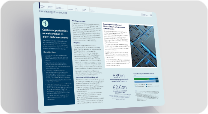 Strategic Shareholder Climate and Risk Financial Financial Barclays PLC 15 report information sustainability report Governance review review statements Annual Report 2022 Our strategy (continued) Strategic context Powering Portland General The scale of the investment needed for a timely Electric’s future with innovative transition is significant. The final decision text a green financing from COP27 stated that $4trn per year needs to be invested in renewables to be able to reach net Bringing together experts from its Power & zero emissions by 2050 and furthermore, a Utilities, Equity Capital Markets and Capture opportunities global transformation to a low-carbon economy Sustainable Capital Markets teams in October is expected to require investments of between as we transition to 2022, Barclays structured a Green Use of a $4-6trn per year. We are determined to capture Proceeds equity offering for Portland General these opportunities by supporting our a low-carbon economy Electric, which saw the issuance of 11.615m customers and clients in their transition. shares of common stock. We want to work alongside customers Progress This novel structure gives investors publicly and clients as they transition to a low- tradable common shares, whose proceeds are As defined by our Sustainable Finance carbon economy, using our advisory and Δ earmarked for investment toward the issuer's Framework, in 2022 we facilitated £25.5bn of financial expertise to help them navigate decarbonisation goals. green financing, reflecting our ability to capture this period of extraordinary change. the opportunities from the transition. Investor reaction was strong for the nearly After a strategic review of our capabilities, Our objectives $500m offering, which was oversubscribed market demand and growth opportunities, in and priced at a tight discount relative to the • Using our financial and capital markets December we announced a new target to size of the deal. expertise to support the scale-up of low- facilitate $1trn of Sustainable and Transition carbon technologies, infrastructure and The proceeds of this offering are designated Financing between 2023 and the end of 2030. capacity to the construction of a 311 MW wind energy In addition, we also announced that we will be • Supporting clients to decarbonise by facility, as well as additional renewable and providing financial advice and finance, increasing our investment into global climate- battery storage projects. including supporting the transition towards tech start-ups through our Sustainable Impact a low-carbon economy Capital portfolio to £500m by the end of 2027, • Continuing to develop green and As noted in last year's Annual Report, we sustainable banking products, including strengthened our risk and control governance, green mortgages, bonds, loans and Green financing facilitated (2018-2030) recognising climate as a Principal Risk. investment funds eligible under our updated £bn Barclays’ Sustainable Finance Framework £89m Evolution in 2023 and beyond • Investing in sustainability-focused start-ups Aligned to our new $1trn target, we will continue invested through our Sustainable 62.2 25.5△ with growth potential to invest in our business, with the aim of creating Impact Capital Programme 87.8 • Continuing to make progress to achieve our a centre of excellence for sustainable finance ambition to become a net zero bank by within the CIB, delivering a fuller suite of Progress from 2018 to 2021 2022 progress n n 2050, including aligning all of our financing to products, solutions, and expertise to clients as Total achieved to date Against a target of £100bn by 2030 n n the goals and timelines of the Paris they navigate the transition towards a low- £2.6bn Agreement, consistent with limiting the carbon economy. increase in global temperatures to 1.5°C Green home mortgages Notes: In the next phase of our Sustainable Impact a $4-6trn as referenced at COP27 at unfccc.int/documents/624444 as issued since 2018 • Continuing to reinforce our social and Capital investments we expect will see an well as the United Nations Environment Programme - Emissions Gap environmental policies through our Barclays was one of the first major lenders to launch Report 2022 at unep.org/resources/emissions-gap-report-2022. enhanced focus on decarbonisation governance a Green Mortgage in 2018 and in January 2022, Δ 2022 data subject to independent Limited Assurance under technologies which are enabling the transition ISAE(UK)3000 and ISAE3410. Current and previous limited assurance we announced the launch of Green Home scope and opinions can be found within the ESG Resource Hub for Buy-to-let Mortgages within carbon-intensive sectors, particularly further details: home.barclays/sustainability/esg-resource-hub/ carbon capture and hydrogen technologies. reporting-and-disclosures/
