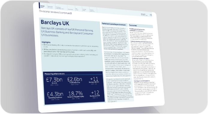 Strategic Shareholder Climate and Risk Financial Financial Barclays PLC 49 report information sustainability report Governance review review statements Annual Report 2022 Divisional reviews (continued) Market and operating environment Focus areas Barclays UK Against a challenging economic and political Providing exceptional service backdrop this year, customer confidence in and insights to customers: both the UK economy and its impact on their We aim to provide simple, relevant and prompt Barclays UK consists of our UK Personal Banking, personal finances fell. Inflationary pressures services and propositions for our customers so have put significant strain on our customers in they have greater choice and access to the UK Business Banking and Barclaycard Consumer the UK and elsewhere, with many adapting to support they need to make their money work address these challenges, from changing their UK businesses. for their individual circumstances. spending habits to paying down higher cost Driving technology and digital innovation: debts. As a bank, we have an important duty to We continue to invest in our digital capabilities, play in society, and use our expertise to help upgrading our systems, moving to cloud people with their financial wellbeing, providing Highlights technology and implementing automation of them with the support they need to navigate • UK Personal Banking offers retail solutions to help customers with their day-to-day banking manual processes. This is intended to allow us these uncertain times, including help with needs. money management and budgeting. to deliver a more personalised digital experience, reduce cost and create additional • UK Business Banking serves business clients, from high-growth start-ups to SMEs, with There continues to be a significant shift towards capacity to support more of our customers. It specialist advice for their business banking needs. digital adoption and demand for digital financial aims to give us the capability to drive service • Barclaycard Consumer UK is a leading credit card provider, offering flexible borrowing and services to meet day-to-day needs. The and improve financial inclusion. payment solutions, while delivering a leading customer experience. changes in competition over the past decade Continuing to grow our business: makes addressing these evolving customer We are pursuing partnership and acquisition expectations even more pertinent. We aim to opportunities to build and deliver better provide customers with banking services in new propositions and services, while continuing to and innovative ways, embracing technology as a innovate across our Barclays platforms to means of making things simpler, more unlock new and sustainable income streams. In transparent and more secure. Whilst we have the unsecured lending space, in particular, we are working with partners such as Avios, to seen an increase in the number of customers adapt to evolving customer demands as they moving to digital, there remains a cohort of Measuring where we are look for flexibility, convenience and safety from customers who are digitally less confident, and their lending solutions - driving a shift from require more traditional points of engagement. overdrafts, towards reward credit cards and UK regulation continues to evolve, seeking to instalment lending. £7.3bn £2.6bn +11 provide higher levels of protection for the Evolving our societal purpose: Income Profit before tax Barclays UK NPS consumer. The Consumer Duty, due to come We are working across the communities in 2021: £6.5bn 2021: £2.5bn 2021: +11 into force in July 2023, is focused on ensuring which we serve to support financial inclusion that firms deliver good customer and client and recognise our role in supporting the outcomes through: ensuring those products transition towards a low-carbon economy. We and services provide fair value; enabling are reinventing how we support customers in informed decision-making and providing the community and also seeking to preserve support that meets the needs of customers £4.3bn 18.7% +12 access to banking for consumers and and clients. These key principles align with the Operating expenses Return on Tangible Equity Barclaycard NPS businesses over the long term. Barclays UK Purpose and strategy, and we are 2021: £4.4bn 2021: 17.6% 2021: +4 committed to ensuring that the Consumer Duty is demonstrably embedded throughout the organisation.