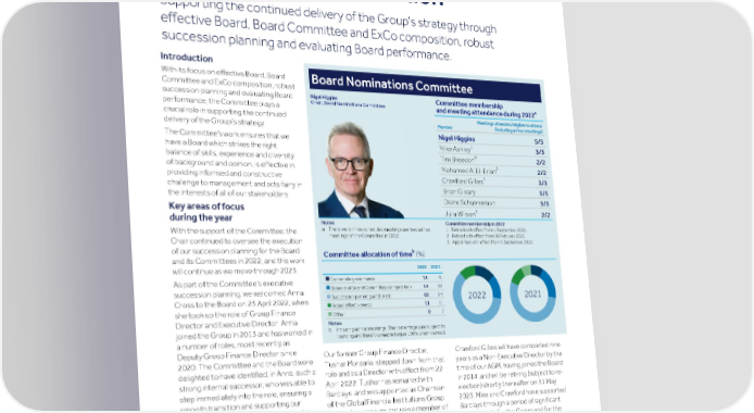 Strategic Shareholder Climate and Risk Financial Financial Barclays PLC 157 report information sustainability report Governance review review statements Annual Report 2022 Directors’ report: Board Nominations Committee report Overseeing effective composition, succession and evaluation Supporting the continued delivery of the Group’s strategy through effective Board, Board Committee and ExCo composition, robust succession planning and evaluating Board performance. Introduction With its focus on effective Board, Board Board Nominations Committee Committee and ExCo composition, robust Committee membership Nigel Higgins succession planning and evaluating Board a Chair, Board Nominations Committee and meeting attendance during 2022 performance, the Committee plays a Meetings attended/eligible to attend crucial role in supporting the continued Member (including ad hoc meetings) delivery of the Group’s strategy. Nigel Higgins 5/5 The Committee’s work ensures that we 1 Mike Ashley 3/3 have a Board which strikes the right 2 Tim Breedon 2/2 balance of skills, experience and diversity 3 of background and opinion, is effective in Mohamed A. El-Erian 2/2 1 providing informed and constructive Crawford Gillies 3/3 challenge to management and acts fairly in Brian Gilvary 5/5 the interests of all of our stakeholders. Diane Schueneman 5/5 Key areas of focus 3 Julia Wilson 2/2 during the year Notes Committee membership in 2022 a There were three scheduled meetings and two ad hoc 1 Retired with effect from 1 September 2022. With the support of the Committee, the meetings of the Committee in 2022. 2 Retired with effect from 28 February 2022. Chair continued to oversee the execution 3 Appointed with effect from 1 September 2022. of our succession planning for the Board b Committee allocation of time (%) and its Committees in 2022, and this work 2022 2021 will continue as we move through 2023. 14 9 n Corporate governance As part of the Committee’s executive 14 19 n Board and Board Committee composition succession planning, we welcomed Anna 62 54 n Succession planning and talent Cross to the Board on 23 April 2022, when 11 11 n Board effectiveness she took up the role of Group Finance 0 7 n Other Director and Executive Director. Anna Notes b Including ad hoc meetings. The percentages are subject to joined the Group in 2013 and has worked in rounding and therefore may not equal 100% when rounded. a number of roles, most recently as Deputy Group Finance Director since Crawford Gillies will have completed nine Our former Group Finance Director, 2020. The Committee and the Board were years as a Non-Executive Director by the Tushar Morzaria, stepped down from that delighted to have identified, in Anna, such a time of our AGM, having joined the Board role and as a Director with effect from 22 strong internal successor, who was able to in 2014, and will be retiring (subject to re- April 2022. Tushar has remained with step immediately into the role, ensuring a election) shortly thereafter on 31 May Barclays, and was appointed as Chairman smooth transition and supporting our 2023. Mike and Crawford have supported of the Global Financial Institutions Group. Group Chief Executive and his leadership Barclays through a period of significant Tushar has been an invaluable member of team with the ongoing delivery of our change, both for the Group and for the the senior management team at Barclays Group strategy. industry, in the post-financial crisis period. since 2013, when he joined as Group Finance We also welcomed Robert Berry to the The Committee and the Board are Director, and he has played a significant role in Board, who joined as a Non-Executive enormously grateful for Mike and the rebuilding of the Group’s financial and Director on 8 February 2022, and as Chair Crawford's significant contributions to the operational resilience. The Committee and of the Board Risk Committee and a Group during the course of their tenures, the Board are grateful for his hard work and member of the Board Audit Committee and the work they have each undertaken are delighted that Tushar has a continuing with effect from 1 March 2022. Robert as valued members of the Board, and in role with Barclays. brings with him a wealth of risk their respective roles as Chair of the Board As announced on 23 January 2023, Mike management experience from his Audit Committee and Chair of the Ashley will be retiring from the Board at the distinguished career at Goldman Sachs. BBUKPLC Board in particular. conclusion of our 2023 AGM, having served With effect from 1 April 2023, Julia Wilson on the Board for more than nine years. Mike will succeed Mike Ashley as Board Audit has served on the Board since 2013 and is Committee Chair, subject to regulatory our Board Audit Committee Chair.