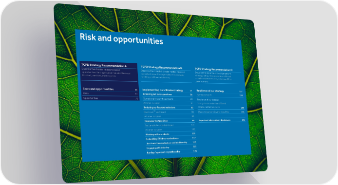 Risk and opportunities TCFD Strategy Recommendation A: TCFD Strategy Recommendation B: TCFD Strategy Recommendation C: Describe the climate-related risks and Describe the impact of climate-related risks and Describe the resilience of the organisation’s opportunities the organisation has identified over opportunities on the organisation’s businesses, strategy, taking into consideration different the short, medium, and long term. strategy, and financial planning. climate-related scenarios, including a 2°C or lower scenario. Risks and opportunities Implementing our climate strategy Resilience of our strategy 73 77 127 Risks 74 Achieving net zero operations 78 Scenario analysis 128 Opportunities 76 Operational footprint dashboard 80 Resilience of our strategy, All other narrative 81 taking into consideration different climate-related scenarios Reducing our financed emissions 85 135 TM BlueTrack dashboard 88 Macro-dependencies and objectives 135 All other narrative 89 Financing the transition 99 Important information / disclaimers 136 Sustainable finance dashboard 101 All other narrative 102 Working with our clients 103 Embedding ESG into our business 117 Just transition and nature and biodiversity 119 Engaging with industry 122 Barclays' approach to public policy 126