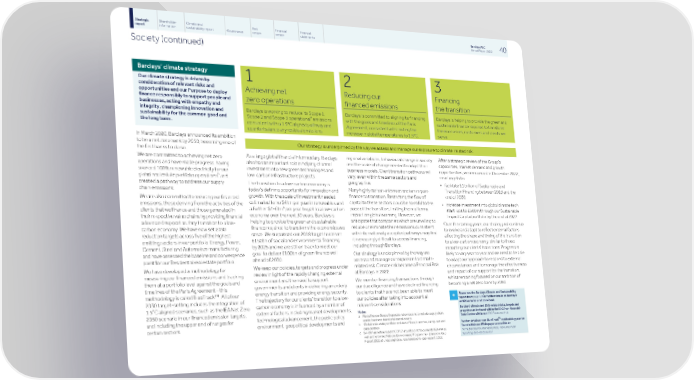 Strategic Shareholder Climate and Risk Financial Financial Barclays PLC 40 report information sustainability report Governance review review statements Annual Report 2022 Society (continued) Barclays’ climate strategy 1 2 3 Our climate strategy is driven by consideration of relevant risks and Achieving net Reducing our Financing opportunities and our Purpose to deploy finance responsibly to support people and zero operations financed emissions the transition businesses, acting with empathy and integrity, championing innovation and Barclays is working to reduce its Scope 1, Barclays is committed to aligning its financing Barclays is helping to provide the green and a sustainability for the common good and Scope 2 and Scope 3 operational emissions with the goals and timelines of the Paris sustainable finance required to transform the long term. consistent with a 1.5°C aligned pathway and Agreement, consistent with limiting the the economies, customers and clients we counterbalance any residual emissions. increase in global temperatures to 1.5°C. serve. In March 2020, Barclays announced its ambition to be a net zero bank by 2050, becoming one of Our strategy is underpinned by the way we assess and manage our exposure to climate-related risk. the first banks to do so. After a strategic review of the Group’s regional variations, behavioural change in society As a large global financial intermediary, Barclays We are committed to achieving net zero capabilities, market demand and growth and the scale of change needed to adapt their also has an important role in helping channel operations and have made progress, having opportunities, we announced in December 2022, business models. Client transition pathways will investment into new green technologies and sourced 100% renewable electricity for our b new targets to: vary, even within the same sectors and low-carbon infrastructure projects. global real estate portfolio operations and geographies. • facilitate $1 trillion of Sustainable and created a pathway to address our supply The transition to a low-carbon economy is Transition Financing between 2023 and the Many highly carbon-intensive sectors require chain emissions. today’s defining opportunity for innovation and end of 2030. finance to transition. Restricting the flow of growth. With the scale of investment needed We are also committed to reducing our financed capital to these sectors could be harmful to the estimated to be $4trn per year in renewables and • increase investment into global climate tech emissions, those deriving from the activities of the c pace of the transition, limiting the real terms a further $4-6trn per year to get to a low-carbon start-ups to £500m through our Sustainable clients that we finance and those generated in impact on global warming. However, we economy over the next 30 years, Barclays is Impact Capital portfolio by the end of 2027. their respective value chains by providing financial anticipate that companies which are unwilling to helping to provide the green and sustainable advice and support as they transition to a low- Over the coming years, our strategy will continue reduce or eliminate their emissions consistent finance required to transform the economies we carbon economy. We have now set 2030 to evolve and adapt to reflect external factors with internationally accepted pathways may find serve. We surpassed our 2018 target to deliver reduction targets across five of the highest- affecting the shape and timing of the transition it increasingly difficult to access financing, £150bn of social and environmental financing emitting sectors in our portfolio: Energy, Power, to a low-carbon economy, similar to those including through Barclays. by 2025 and we are still on track to meet our Cement, Steel and Automotive manufacturing impacting our clients' transitions. Progress is goal to deliver £100bn of green finance well Our strategy is underpinned by the way we and have assessed the baseline and convergence likely to vary year to year and we need to be able ahead of 2030. assess and manage our exposure to climate- point for our Residential real estate portfolio. to adapt our approach to respond to external related risk. Climate risk became a Principal Risk We keep our policies, targets and progress under circumstances and to manage the effectiveness We have developed a methodology for at Barclays in 2022. review in light of the rapidly changing external and impact of our support for the transition, measuring our financed emissions and tracking environment and the need to support whilst remaining focused on our ambition of We monitor financing transactions through them at a portfolio level against the goals and governments and clients in delivering an orderly becoming a net zero bank by 2050. our due diligence and have declined financing timelines of the Paris Agreement – this energy transition and providing energy security. to clients that have not been able to meet methodology is called BlueTrack™. All of our Please see the Barclays Climate and Sustainability The trajectory for our clients’ transition to a low- our policies after taking into account all 2030 target-setting includes the integration of + report from page 69 for further details on Barclays' o carbon economy is influenced by a number of ambition to be a net zero bank. relevant considerations. 1.5 C aligned scenarios, such as the IEA Net Zero Barclays' climate and ESG-related data, targets and external factors, including market developments, 2050 scenario in our financed emission targets, Notes progress can be found within the ESG (non-financial) a We define our Scope 3 operational emissions to include supply chain, technological advancement, the public policy and including the upper end of ranges for Data Centre within our ESG Resource Hub waste, business travel and leased assets. environment, geopolitical developments and TM certain sectors. b Global real estate portfolio 