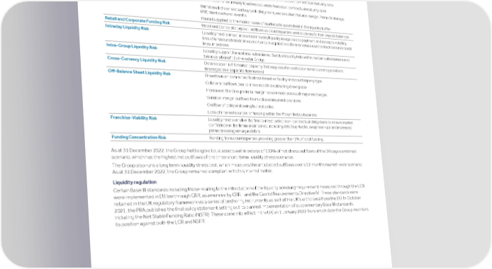 Strategic Shareholder Climate and Risk Financial Financial Barclays PLC 345 report information sustainability report Governance review review statements Annual Report 2022 Risk performance - Treasury and Capital risk (continued) Key LRA assumptions For the year ended 31 December 2022 Drivers of Liquidity Risk LRA Combined stress – key assumptions Wholesale Secured and Unsecured Funding Risk Zero rollover of maturing wholesale unsecured funding Partial loss of repo capacity on non-extremely liquid repos at contractual maturity date Roll of repo for extremely liquid repo at wider haircut at contractual maturity date Withdrawal of contractual buyback obligations, excess client futures margin, Prime Brokerage (PB) client cash and overlifts Haircuts applied to the market value of marketable assets held in the liquidity buffer Retail and Corporate Funding Risk Retail and Corporate deposit outflows as counterparties seek to diversify their deposit balances Intraday Liquidity Risk Liquidity held to meet increased intraday liquidity usage due to payment and receipts volatility, loss of unsecured credit lines and haircuts applied to collateral values used to back secured credit lines, in a stress Intra-Group Liquidity Risk Liquidity support for material subsidiaries. Surplus liquidity held within certain subsidiaries is not taken as a benefit to the wider Group Cross-Currency Liquidity Risk Deterioration in FX market capacity that may result in restriction in net currency positions (managed as a separate framework) Off-Balance Sheet Liquidity Risk Drawdown on committed facilities based on facility and counterparty type Collateral outflows due to a two-notch credit rating downgrade Increase in the Group's initial margin requirement across all major exchanges Variation margin outflows from collateralised risk positions Outflow of collateral owing but not called Loss of internal sources of funding within the PB synthetics business Franchise-Viability Risk Liquidity held to enable the firm to meet select non-contractual obligations to ensure market confidence in the firm is maintained, including debt buy-backs, swap tear-ups and increased prime brokerage margin debits Funding Concentration Risk Funding from counterparties providing greater than 1% of total funding As at 31 December 2022, the Group held eligible liquid assets well in excess of 100% of net stress outflows of the 30 days combined scenario, which has the highest net outflows of the three short-term liquidity stress scenarios. The Group also runs a long term liquidity stress test, which measures the anticipated outflows over a 12 months market-wide scenario. As at 31 December 2022, the Group remained compliant with this internal metric. Liquidity regulation Certain Basel III standards including those relating to the introduction of the liquidity adequacy requirement measured through the LCR were implemented in EU law through CRR, as amended by CRRII, and the Capital Requirements Directive IV. These standards were retained in the UK regulatory framework via a series of onshoring instruments as part of the UK’s withdrawal from the EU. In October 2021, the PRA published the final policy statement setting out its planned implementation of supplementary Basel III standards, including the Net Stable Funding Ratio (NSFR). These came into effect in the UK on 1 January 2022 from which date the Group monitors its position against both the LCR and NSFR.