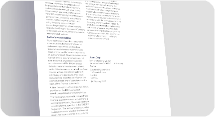 Strategic Shareholder Climate and Risk Financial Financial Barclays PLC 415 report information sustainability report Governance review review statements Annual Report 2022 KPMG LLP’s independent auditor’s report to the members of Barclays PLC (continued) 9. Respective responsibilities 10. The purpose of our audit work and to whom we owe our Directors’ responsibilities responsibilities As explained more fully in their statement set out on page 152, the Directors are This report is made solely to the responsible for: the preparation of the Company’s members, as a body, in financial statements including being accordance with Chapter 3 of Part 16 of satisfied that they give a true and fair view; the Companies Act 2006 and the terms of such internal control as they determine is our engagement by the Company. Our necessary to enable the preparation of audit work has been undertaken so that we financial statements that are free from might state to the Company’s members material misstatement, whether due to those matters we are required to state to fraud or error; assessing the Group and them in an auditor’s report and the further Parent Company’s ability to continue as a matters we are required to state to them in going concern, disclosing, as applicable, accordance with the terms agreed with the matters related to going concern; and Company, and for no other purpose. To using the going concern basis of the fullest extent permitted by law, we do accounting unless they either intend to not accept or assume responsibility to liquidate the Group or the parent Company anyone other than the Company and the or to cease operations, or have no realistic Company’s members, as a body, for our alternative but to do so. audit work, for this report, or for the opinions we have formed. Auditor’s responsibilities Our objectives are to obtain reasonable assurance about whether the financial statements as a whole are free from material misstatement, whether due to fraud or error, and to issue our opinion in an auditor’s report. Reasonable assurance Stuart Crisp is a high level of assurance but does not (Senior Statutory Auditor) guarantee that an audit conducted in for and on behalf of KPMG LLP, Statutory accordance with ISAs (UK) will always Auditor detect a material misstatement when it exists. Misstatements can arise from fraud Chartered Accountants or error and are considered material if, 15 Canada Square individually or in aggregate, they could London reasonably be expected to influence the E14 5GL economic decisions of users taken on the 14 February 2023 basis of the financial statements. A fuller description of our responsibilities is provided on the FRC’s website at www.frc.org.uk/auditorsresponsibilities. The Company is required to include these financial statements in an annual financial report prepared using the single electronic reporting format specified in the TD ESEF Regulation. The auditor’s report provides no assurance over whether the financial report has been prepared in accordance with that format.
