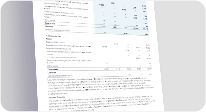 Strategic Shareholder Climate and Risk Financial Financial Barclays PLC 503 report information sustainability report Governance review review statements Annual Report 2022 Notes to the financial statements (continued) Scope of consolidation Summary of interests in unconsolidated structured entities Short-term traded Secured financing interests Traded derivatives Other interests Total £m £m £m £m £m As at 31 December 2022 Assets Trading portfolio assets — 8,632 — — 8,632 Financial assets at fair value through the income statement 75,166 — — 2,459 77,625 Derivative financial instruments — — 4,555 — 4,555 Financial assets at fair value through other comprehensive income — — — 423 423 Loans and advances at amortised cost — — — 44,292 44,292 Reverse repurchase agreements and other similar secured lending 117 — — — 117 Other assets — — — 69 69 Total assets 75,283 8,632 4,555 47,243 135,713 Liabilities — Derivative financial instruments — — 8,460 — 8,460 As at 31 December 2021 Assets Trading portfolio assets — 7,170 — — 7,170 Financial assets at fair value through the income statement 61,816 — — 3,490 65,306 Derivative financial instruments — — 5,160 — 5,160 Financial assets at fair value through other comprehensive income — — — 91 91 Loans and advances at amortised cost — — — 28,227 28,227 Reverse repurchase agreements and other similar secured lending 104 — — — 104 Other assets — — — 17 17 Total assets 61,920 7,170 5,160 31,825 106,075 Liabilities Derivative financial instruments — — 9,543 — 9,543 Secured financing arrangements, short-term traded interests and traded derivatives are typically managed under Market risk management policies described in the Market risk management section which includes an indication of the change of risk measures compared to last year. For this reason, the total assets of these entities are not considered meaningful for the purposes of understanding the related risks and so have not been presented. Other interests include conduits and lending where the interest is driven by normal customer demand. As at 31 December 2022, there were 6,267 (2021: 5,891) structured entities that Barclays entered into transactions with. Secured financing The Group routinely enters into reverse repurchase contracts, margin lending, stock borrowing and similar arrangements on normal commercial terms where the counterparty to the arrangement is a structured entity. Due to the nature of these arrangements, especially the transfer of collateral and ongoing margining, the Group is able to manage its variable exposure to the performance of the structured entity counterparty. The counterparties included in secured financing mainly include hedge fund limited structures, investment companies and special purpose entities. Short-term traded interests As part of its market making activities, the Group buys and sells interests in structured vehicles, which are predominantly debt securities issued by asset securitisation vehicles. Such interests are typically held individually or as part of a larger portfolio for no more than 90 days. In such cases, the Group typically has no other involvement with the structured entity other than the securities it holds as part of trading activities and its maximum exposure to loss is restricted to the carrying value of the asset. Traded derivatives The Group enters into a variety of derivative contracts with structured entities which reference market risk variables such as interest rates, equities, foreign exchange rates and credit indices among other things. The main derivative types which are considered interests in structured entities include equity options, index-based and entity-specific credit default swaps, and total return swaps. Interest rate swaps and foreign exchange derivatives that are not complex and which expose the Group to insignificant credit risk by being senior in the payment waterfall of a securitisation and derivatives that are determined to introduce risk or variability to a structured entity are not considered to be an interest in an entity and have been excluded from the disclosures. A description of the types of derivatives and the risk management practices are detailed in Note 14. The risk of loss may be mitigated through ongoing margining requirements as well as a right to cash flows from the structured entity which are senior in the payment