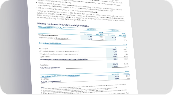 Strategic Shareholder Climate and Risk Financial Financial Barclays PLC 361 report information sustainability report Governance review review statements Annual Report 2022 Risk performance - Treasury and Capital risk (continued) The UK leverage ratio increased to 5.3% (December 2021: 5.2%) primarily due to a £7.9bn decrease in the leverage exposure and a £0.6bn increase in Tier 1 capital. The UK leverage exposure decreased to £1,130.0bn (December 2021: £1,137.9bn) largely due to the following movements: • £53.1bn decrease in PFE on derivatives largely driven by increased netting eligibility due to the introduction of SA-CCR • £42.0bn decrease in cash at central banks net of the qualifying central bank claims exemption primarily due to the matching of allowable liabilities rather than deposits introduced under the UK leverage ratio framework and a decrease in Swiss Franc cash assets • £33.0bn increase in loans and advances and other assets (excluding cash and settlement balances which are subject to regulatory exemptions) primarily due to increased lending • £29.5bn increase in derivative financial instruments post additional regulatory netting and adjustments for cash collateral primarily driven by market volatility, increased activity in CIB and the application of a 1.4 multiplier introduced under SA-CCR • £18.4bn increase in SFTs primarily driven by increased reverse repurchase activity in CIB The average UK leverage ratio decreased to 4.8% (December 2021: 4.9%) due to a £51.9bn increase in average leverage exposure partially offset by a £1.1bn increase in average T1 capital. The average UK leverage exposure increased to £1,281.0bn (December 2021: £1,229.0bn) mainly driven by increased activity during the year that was partially offset by the impact of regulatory changes that came into effect from 1 January 2022 under the UK leverage ratio framework. Minimum requirement for own funds and eligible liabilities a,b,c,d MREL requirements including buffers Requirement (£m): Requirement (%): a a Restated Restated As at 31.12.2022 As at 31.12.2021 As at 31.12.2022 As at 31.12.2021 Requirement based on RWAs 97,387 77,302 28.9 % 24.6 % d Requirement based on UK leverage exposure 91,213 93,975 8.1 % 6.9 % a,c a Own funds and eligible liabilities Restated £m £m CET1 capital 46,878 47,327 e AT1 capital instruments and related share premium accounts 13,224 12,179 e T2 capital instruments and related share premium accounts 8,875 8,626 Eligible liabilities 43,851 39,889 Total Barclays PLC (the Parent company) own funds and eligible liabilities 112,828 108,021 Total RWAs 336,518 314,136 d Total UK leverage exposure 1,129,973 1,356,191 a Restated a Own funds and eligible liabilities ratios as a percentage of: As at 31.12.2022 As at 31.12.2021 Total RWAs 33.5 % 34.4 % d Total UK leverage exposure 10.0 % 8.0 % Notes a Opening balance as at 1 January 2022 has been restated to reflect the impact of the Over-issuance of Securities. See Impact of Over-issuance of Securities on page 356 for further details. b Minimum requirement excludes the confidential institution-specific PRA buffer. c CET1, T1 and T2 capital, and RWAs are calculated applying the transitional arrangements of the CRR as amended by CRR II including IFRS 9 transitional arrangements. d As at 31 December 2021, MREL requirements were on a CRR leverage basis which, from 1 January 2022, was no longer applicable for UK banks. e Includes other AT1 capital regulatory adjustments and deductions of £60m (December 2021: £80m), and other T2 credit risk adjustments and deductions of £125m (December 2021: £87m). As at 31 December 2022, Barclays PLC (the Parent company) held £112.8bn of own funds and eligible liabilities equating to 33.5% of RWAs. This was in excess of the Group's MREL requirement, excluding the PRA buffer, to hold £97.4bn of own funds and eligible liabilities equating to 28.9% of RWAs. The Group remains above its MREL regulatory requirement including the PRA buffer.