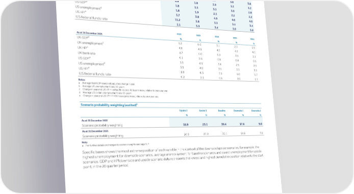 Strategic Shareholder Climate and Risk Financial Financial Barclays PLC 320 report information sustainability report Governance review review statements Annual Report 2022 Risk performance - Credit risk (continued) Upside 1 average macroeconomic variables used in the calculation of ECL 2022 2023 2024 2025 2026 As at 31 December 2022 % % % % % a UK GDP 3.3 1.0 2.3 2.4 2.1 b UK unemployment 3.7 4.0 3.9 3.8 3.8 c UK HPI 8.4 1.8 2.9 3.3 3.2 UK bank rate 1.8 3.5 3.3 3.0 2.8 a US GDP 1.8 1.9 2.3 2.2 2.2 d US unemployment 3.7 3.8 4.0 4.0 4.0 e US HPI 11.2 3.8 3.3 3.4 3.4 US federal funds rate 2.1 3.9 3.4 3.0 3.0 2021 2022 2023 2024 2025 As at 31 December 2021 % % % % % a UK GDP 6.2 6.0 3.1 2.3 1.9 b UK unemployment 4.8 4.6 4.3 4.2 4.1 c UK HPI 4.7 5.0 5.0 3.9 3.3 UK bank rate 0.1 0.6 0.8 0.8 0.5 a US GDP 5.5 4.6 3.4 2.9 2.9 d US unemployment 5.5 4.0 3.5 3.5 3.5 e US HPI 11.8 8.3 7.0 6.0 5.7 US federal funds rate 0.2 0.3 0.6 1.0 1.1 Notes a Average Real GDP seasonally adjusted change in year. b Average UK unemployment rate 16-year+. c Change in year end UK HPI = Halifax All Houses, All Buyers index, relative to prior year end. d Average US civilian unemployment rate 16-year+. e Change in year end US HPI = FHFA house price index, relative to prior year end. a Scenario probability weighting (audited) Upside 2 Upside 1 Baseline Downside 1 Downside 2 % % % % % As at 31 December 2022 Scenario probability weighting 10.9 23.1 39.4 17.6 9.0 As at 31 December 2021 Scenario probability weighting 20.9 27.2 30.1 14.8 7.0 Note a For further details on changes to scenario weights see page 317. Specific bases shows the most extreme position of each variable in the context of the downside/upside scenarios, for example, the highest unemployment for downside scenarios, average unemployment for baseline scenarios and lowest unemployment for upside scenarios. GDP and HPI downside and upside scenario data represents the lowest and highest cumulative position relative to the start point, in the 20 quarter period.