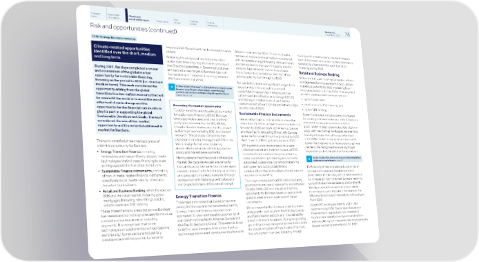 Strategic Shareholder Climate and Risk Financial Financial Barclays PLC 76 report information sustainability report Governance review review statements Annual Report 2022 Risk and opportunities (continued) TCFD Strategy Recommendation (a) beyond 2030. We will continue to review this area deliver on net zero by 2050. This consists of a scaling and commercialising new technologies Climate-related opportunities closely. number of mature and scaling technologies but such as hydrogen and carbon capture, Barclays is identified over the short, medium with renewable energy (including wind and solar) developing a framework for such transition Following the analysis of market demand for and low emissions transport (including electric financing during 2023. and long term sustainable financing, together with a review of vehicles, fuel cell electric vehicles and mass the Group's capabilities, in December 2022 we Retail and Business Banking transit) expected to make up over half of the During 2022, Barclays completed a review announced a new target to facilitate $1trn of Within the UK, sustainable opportunities in Retail addressable market through to 2030. and assessment of the global market Sustainable and Transition Financing between and Business Banking represent a $225-286bn opportunity for sustainable financing, 2023 and the end of 2030. Alongside this, there are significant longer-term market opportunity by 2025, increasing to an focusing on the period to 2030 (i.e. short and opportunities in financing the scaling of estimated $640bn-1trn by 2030. This projected Further details of Barclays' sustainable finance targets can be medium term). This work considered the + capabilities in nascent technologies such as found on page 99 and further details on how Barclays' growth is split across three main sectors: opportunity arising from the global products and services are harnessing this opportunity on carbon capture utilisation and storage (CCUS) pages 103 to 116. • green home loans, transition to a low-carbon economy that will and hydrogen solutions, which we hope to • electric vehicle (EV) financing, and be needed if the world is to avoid the worst capture as part of our $1trn target between 2023 effects of climate change and the Assessing the market opportunity • green SME lending. and the end of 2030. opportunity for the financial community to To determine the addressable global market Green home loans, including green mortgages Sustainable Finance Instruments play its part in supporting the global for sustainable finance to 2030, Barclays for existing and new homes and retrofit financing, Sustainable Finance Instruments represent an Sustainable Development Goals. The work leveraged widely used and credible third- represent the largest individual market at estimated $3.5-6trn annual issuance opportunity considered the size of the market party sources including the IEA, IRENA, $140-170bn in 2025, growing to $400-600bn in through to 2030 across North America, Europe opportunity and the potential addressable Climate Bonds Initiative and the IFC, as well 2030, with new homes mortgages representing and Asia Pacific (excluding China), with Europe market for Barclays. as Barclays' own industry, ESG and market the largest proportion of the opportunity at expected to remain the primary market for ESG research. The analysis considered the c.60-70%. Growth is mainly dependent on UK debt. It was c.60% of global issuance in 2021. investment needed through to 2030 for the The work identified three thematic areas of government delivering on its ambition to achieve world to align to net zero, including While green bonds represented the largest potential opportunity for Barclays: net zero. We recognise there are significant accelerated scenarios reflecting possible individual market at c.$500 bn in 2021, all ESG dependencies for that ambition to be realised. • Energy Transition Finance, including policy and market developments. instruments are expected to grow, including renewables and nascent/early-stage climate Having determined the global addressable Further details of the drivers of change in the Residential Real social loans/bonds (promoting positive social + technologies that will need financing to scale Estate sector can be found on page 93. market, Barclays developed scenarios for outcomes), sustainable loans/bonds (serving as they support the transition to net zero the bank’s potential market for various asset both green and social projects) and EV financing of new and used auto loans has an • Sustainable Finance Instruments, consisting classes, product sets, technological sectors sustainability-linked bonds (loans/bonds indexed estimated 10-year addressable market of of non-climate-related financial instruments, and geographic markets, validated through to green or social KPIs). $240-400bn for Barclays, with EV sales expected specifically social, sustainability-linked and comparison with historic growth rates and to increase 10-fold in the next 10 years, reaching The analysis indicated that ESG debt (excluding transition bonds/loans our projected share of the overall market. up to 97% of annual car sales by 2030 in the UK. green bonds and loans) represents an estimated • Retail and Business Banking, which focuses on Barclays expects the markets to be primarily 10-year $400-650 bn cumulative financing BUK and the retail market, including green driven by policy and legislation, for example, the opportunity for Barclays based on our current Energy Transition Finance mortgages (including retrofitting), electric UK policy to ban sale of new petrol and diesel cars global market share in sustainable finance The analysis indicated that based on current vehicle loans and SME lending. from 2030. instruments. policy, technology and market developments, These three thematic areas cut across Barclays' Green SME lending represents a $10-16bn We see opportunities to expand our share and Energy Transition 