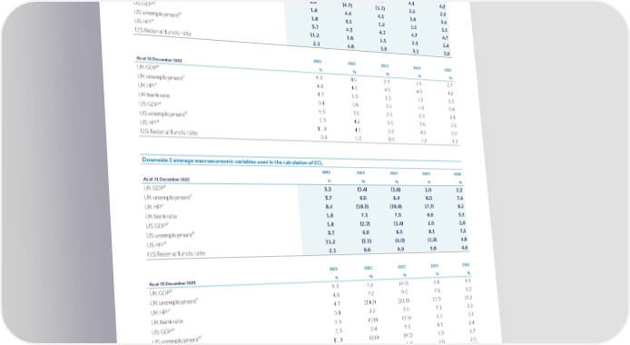 Strategic Shareholder Climate and Risk Financial Financial Barclays PLC 318 report information sustainability report Governance review review statements Annual Report 2022 Risk performance - Credit risk (continued) Baseline average macroeconomic variables used in the calculation of ECL 2022 2023 2024 2025 2026 As at 31 December 2022 % % % % % a UK GDP 3.3 (0.8) 0.9 1.8 1.9 b UK unemployment 3.7 4.5 4.4 4.1 4.2 c UK HPI 8.4 (4.7) (1.7) 2.2 2.2 UK bank rate 1.8 4.4 4.1 3.8 3.4 a US GDP 1.8 0.5 1.2 1.5 1.5 d US unemployment 3.7 4.3 4.7 4.7 4.7 e US HPI 11.2 1.8 1.5 2.3 2.4 US federal funds rate 2.1 4.8 3.6 3.1 3.0 2021 2022 2023 2024 2025 As at 31 December 2021 % % % % % a UK GDP 6.2 4.9 2.3 1.9 1.7 b UK unemployment 4.8 4.7 4.5 4.3 4.2 c UK HPI 4.7 1.0 1.9 1.9 2.3 UK bank rate 0.1 0.8 1.0 1.0 0.8 a US GDP 5.5 3.9 2.6 2.4 2.4 d US unemployment 5.5 4.2 3.6 3.6 3.6 e US HPI 11.8 4.5 5.2 4.9 5.0 US federal funds rate 0.2 0.3 0.9 1.2 1.3 Downside 2 average macroeconomic variables used in the calculation of ECL 2022 2023 2024 2025 2026 As at 31 December 2022 % % % % % a UK GDP 3.3 (3.4) (3.8) 2.0 2.3 b UK unemployment 3.7 6.0 8.4 8.0 7.4 c UK HPI 8.4 (18.3) (18.8) (7.7) 8.2 UK bank rate 1.8 7.3 7.9 6.6 5.5 a US GDP 1.8 (2.7) (3.4) 2.0 2.6 d US unemployment 3.7 6.0 8.5 8.1 7.1 e US HPI 11.2 (3.1) (4.0) (1.9) 4.8 US federal funds rate 2.1 6.6 6.9 5.8 4.6 2021 2022 2023 2024 2025 As at 31 December 2021 % % % % % a UK GDP 6.2 0.2 (4.0) 2.8 4.3 b UK unemployment 4.8 7.2 9.0 7.6 6.3 c UK HPI 4.7 (14.3) (21.8) 11.9 15.2 UK bank rate 0.1 2.2 3.9 3.1 2.2 a US GDP 5.5 (0.8) (3.5) 2.5 3.2 d US unemployment 5.5 6.4 9.1 8.1 6.4 e US HPI 11.8 (6.6) (9.0) 5.9 6.7 US federal funds rate 0.2 2.1 3.4 2.6 2.0 Notes a Average Real GDP seasonally adjusted change in year. b Average UK unemployment rate 16-year+. c Change in year end UK HPI = Halifax All Houses, All Buyers index, relative to prior year end. d Average US civilian unemployment rate 16-year+. e Change in year end US HPI = FHFA house price index, relative to prior year end.