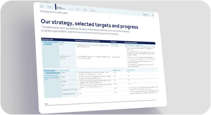 Strategic Shareholder Climate and Risk Financial Financial Barclays PLC 71 report information sustainability report Governance review review statements Annual Report 2022 Introduction (continued) Our strategy, selected targets and progress The table below sets out selected targets and policies we have previously announced, progress against them, and the new announcements we are now making. Strategic pillar Previously announced target/policy Progress New announcement By end 2025 2022 performance We are working towards the following milestones 1.Achieving net zero 2 Δ Energy • 100% renewable electricity sourcing for our global real estate • By end of 2035, 115 kWh/m /year average energy use intensity 100% sourced operations portfolio by end of 2025 across our corporate offices, against a 2022 baseline of 265 2 kWh/m /year • By end of 2035, 10 MW on-site renewable electricity capacity installed across our global real estate portfolio, against a 2022 baseline of 0.26 MW Δ Reduction of GHG • 90% reduction in Scope 1 and 2 GHG emissions (market-based, • By end 2030, 90% of our suppliers, by addressable spend, to −91% reduction emissions against a 2018 baseline) have science-based GHG emissions reduction targets in place • By end 2030, 50% GHG supply chain emissions reduction against a 2018 baseline • By end 2050, 90% GHG supply chain emissions reduction against a 2018 baseline By the end of 2030 Cumulative change By the end of 2030 2.Reducing our Energy • 40% reduction in absolute CO e emissions against a 2020 -32% N/A financed emissions 2 Δ baseline of 75.7 MtCO e (Scopes 1, 2 & 3) 2 Portfolio reduction Power • 50-69% reduction in CO e emissions intensity against a 2020 -9% N/A 2 targets/convergence Δ baseline of 331 kgCO e/MWh (Scope 1) 2 point Cement • 20-26% reduction in CO e emission intensity against a 2021 -2% N/A 2 Δ baseline of 0.625 tCO e/t (Scopes 1 & 2) 2 Steel • 20-40% reduction in CO e emissions intensity against a 2021 -11% N/A 2 Δ baseline of 1.945 tCO e/t (Scopes 1 & 2) 2 Automotive manufacturing N/A N/A • 40-64 % reduction in CO e emissions intensity against a 2022 2 Δ baseline of 167.2 gCO e/km (Scopes 1, 2 & 3) 2 Residential real estate N/A N/A • Convergence point: 40% reduction in CO e emissions intensity 2 Δ 2 against a 2022 baseline of 32.9 kgCO e/m (Scopes 1 & 2) 2 Notes: Δ 2022 data subject to independent Limited Assurance under ISAE(UK)3000 and ISAE3410. Current and previous limited assurance scope and opinions can be found within the ESG Resource Hub for further details: home.barclays/sustainability/esg-resource-hub/reporting-and-disclosures/